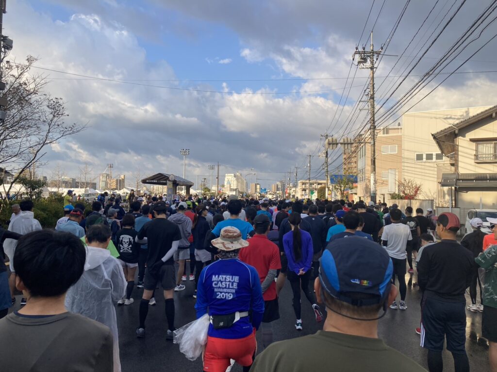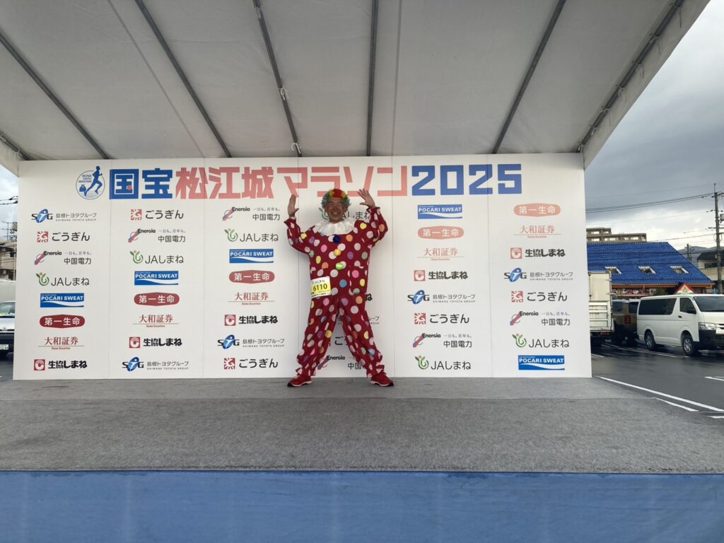 車中泊していた松江駅近くのコインパーキングから徒歩で会場の松江市総合体育館に向かいます。徒歩で約10分、会場の松江市総合体育館に着くとすでの多くのランナーが集まってます。フルマラソンの参加者は4597人と中規模な大会なので、会場内は混んでます。スタート前に小雨が降ってきて、みんな屋根のある所で雨をしのいでましたが、スタートの頃には止んでくれました。今回は制限時間が6時間なので、いつもどおりピエロの仮装をして、景色とエイドを楽しみながら走ります。スタートの時には雨は止んでお天気も良く、絶好のマラソン日和ですが、海沿いを走るので風が強そうです。スタート15分前の8時15分になって、道路規制が始まり、ランナーは各自スタートブロックに整列してスタートを待ちます。私はいつもどおり最後尾からスタートするので、最後尾でスタートを待ちます。周りのランナーと話をしながら待っていると、スタート時間の8時30分になり、号砲が鳴りスタート。最後尾の私は約5分後にスタートラインを通過して走り始めました。