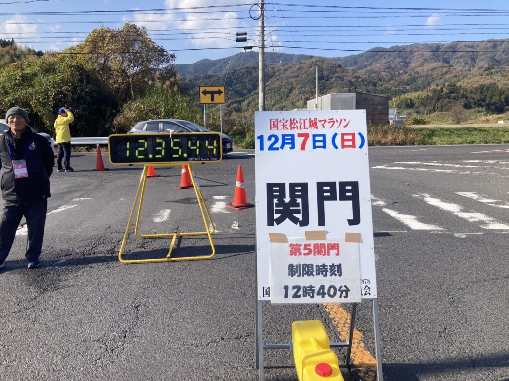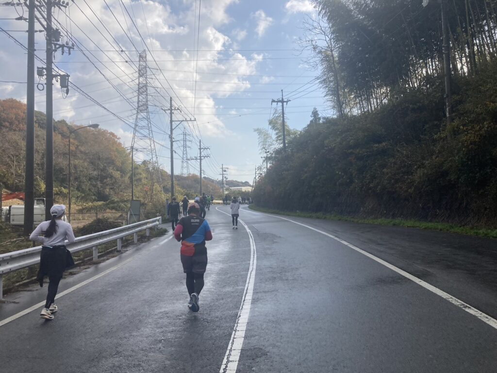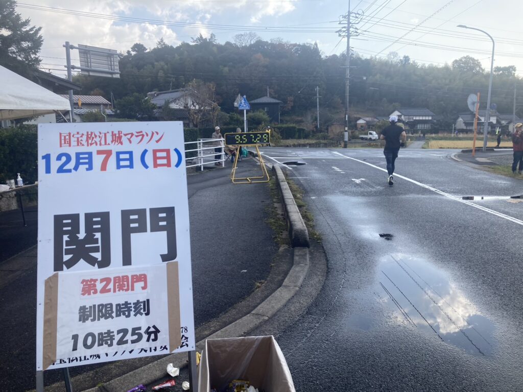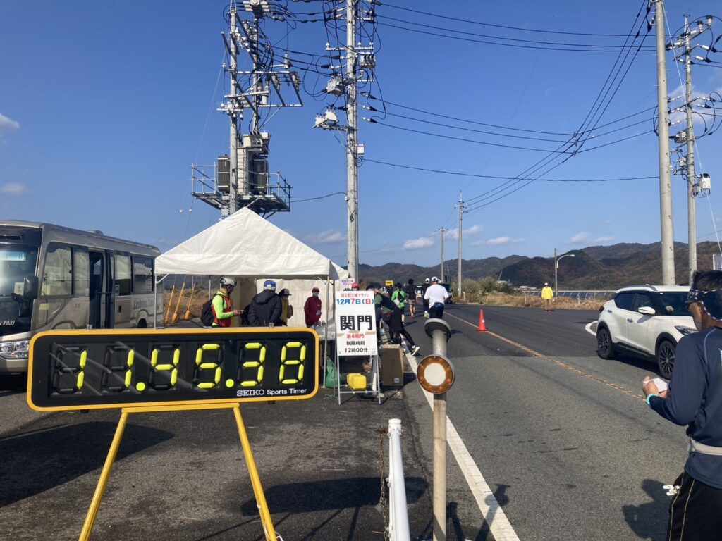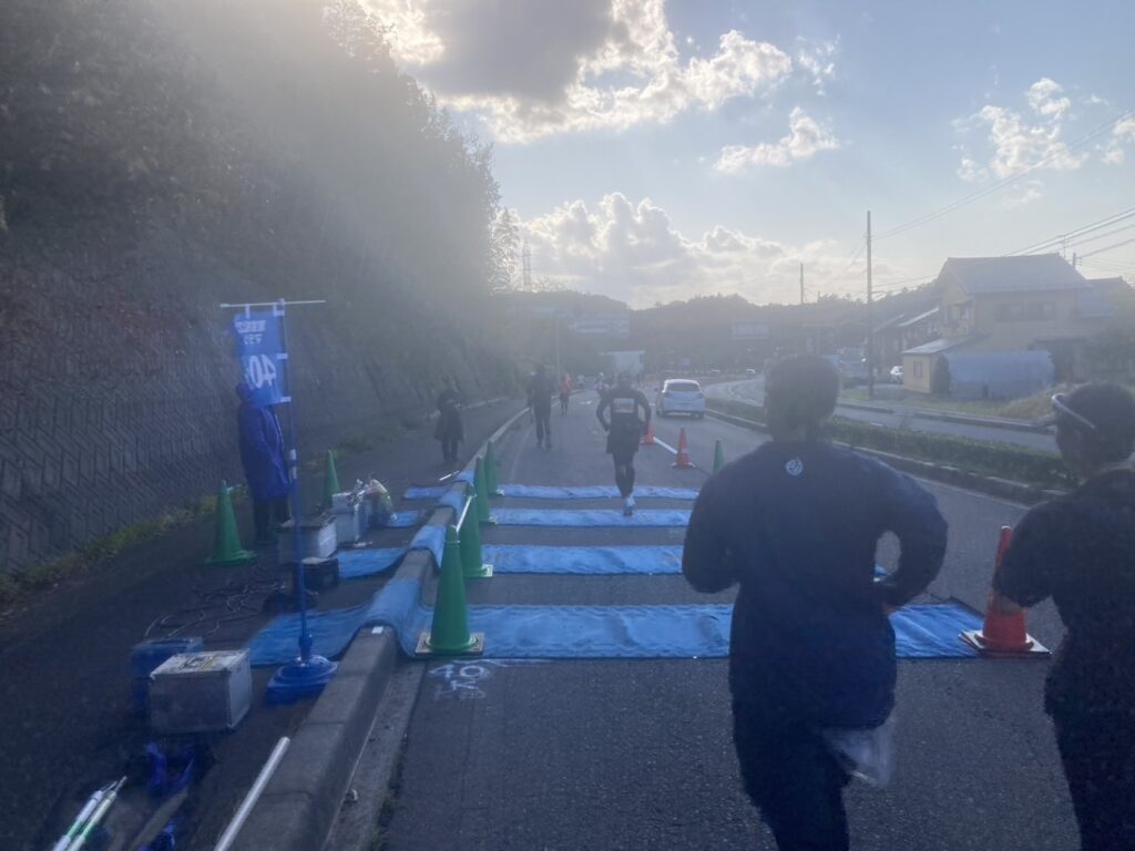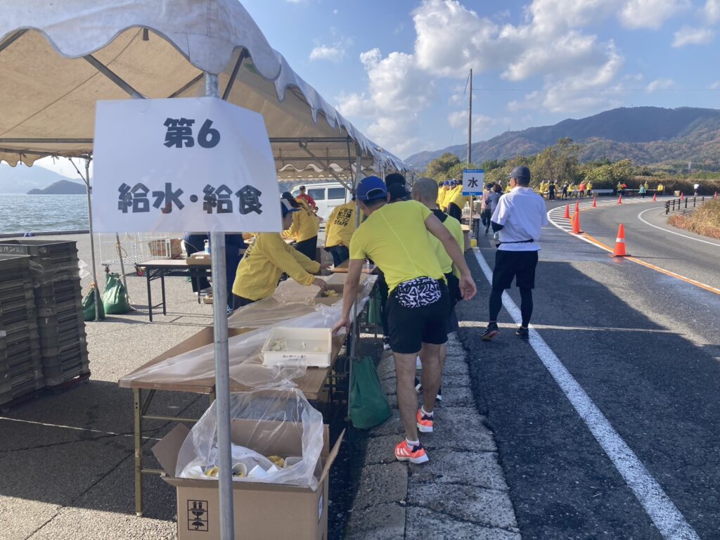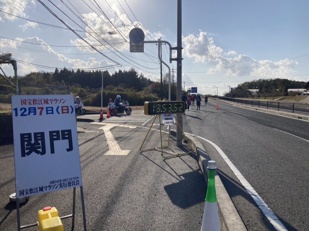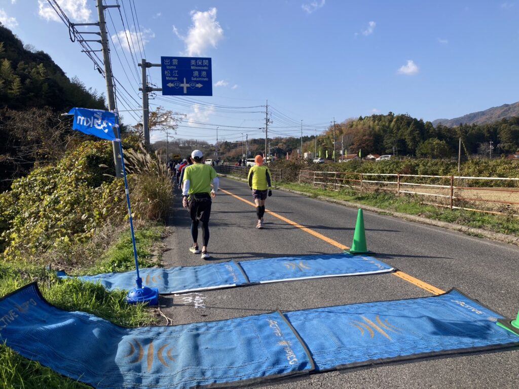 そんなことを思いながら進み、30.3kmの第7エイドに到着。ここでは宍道湖名産のしじみを使った「しじみ汁」は振舞われるはずでしたが、予想どおり売り切れ。ただ、食べ物が少しだけ残っていて、初めての給食をします。道の駅本庄、弁慶海道と進み、この先は海を離れて内陸を進むので、風が少し治まります。35km地点を通過して、国道431号線をゴール目指して進んみます。この先、大きな上り下りが2回ありますが、風が治まってだいぶ楽です。上り坂の途中に、私設エイド(私が見る限り唯一の私設エイド)があって応援してくれます。38.7km地点の第6関門を16分前に通過。この間、だいぶ走ったので時間に少し余裕があります。