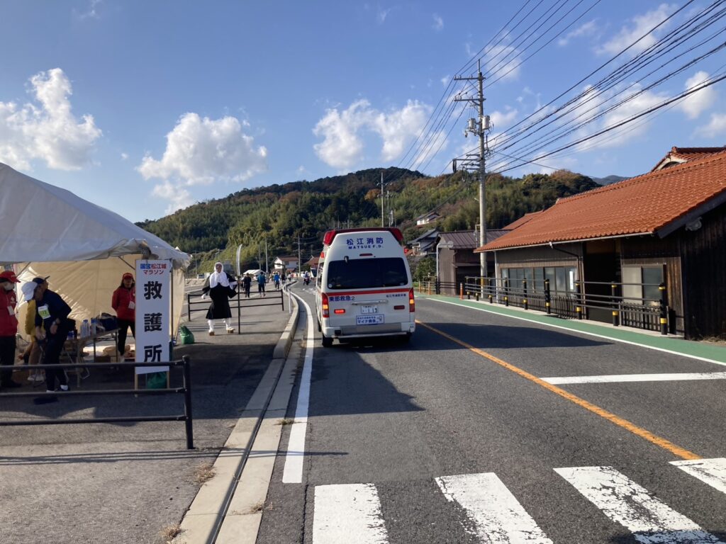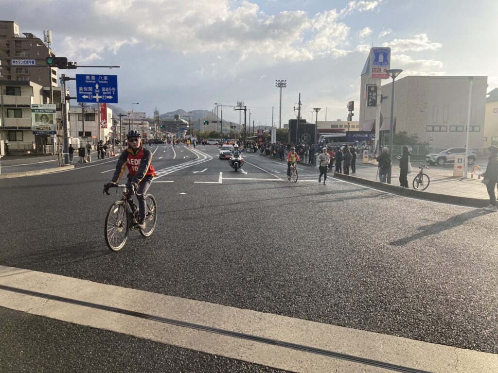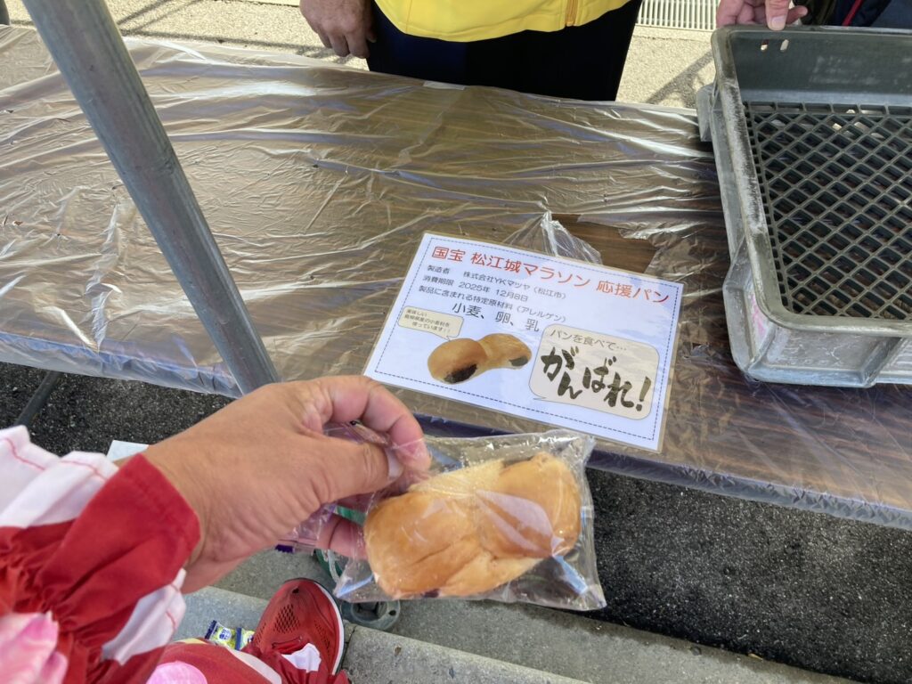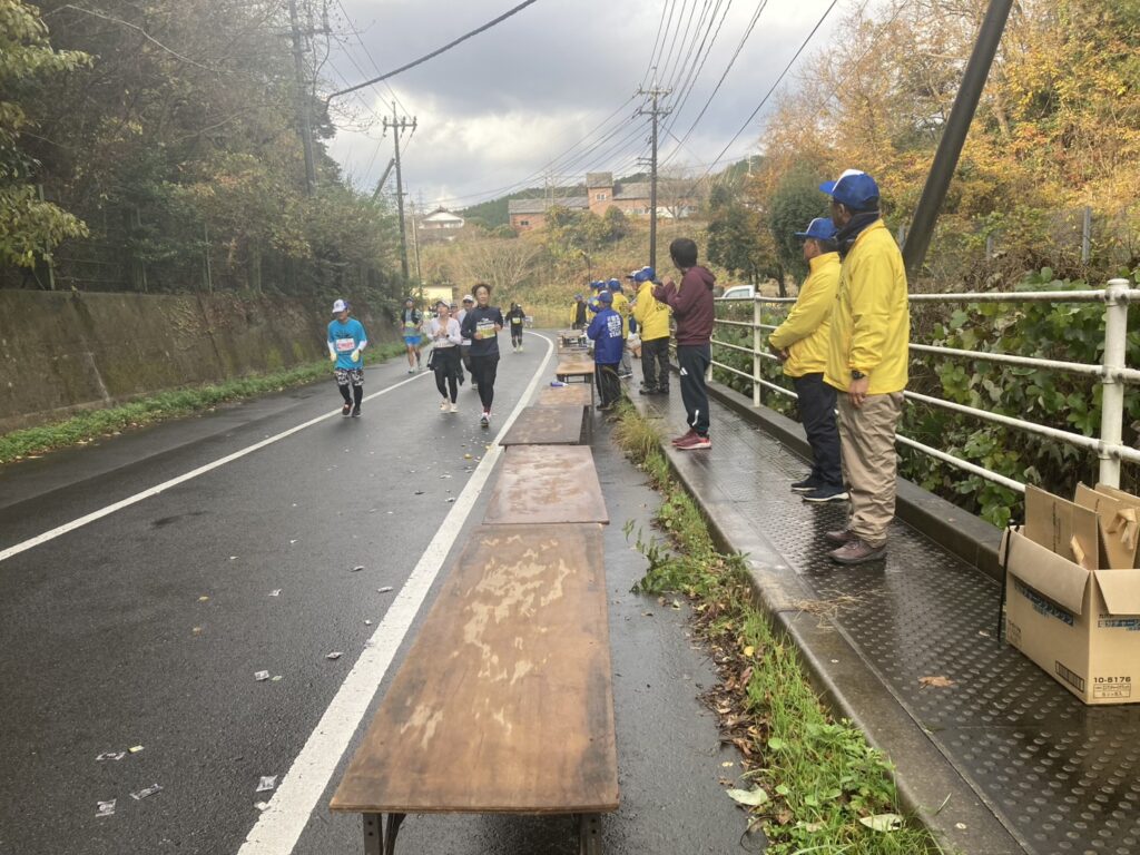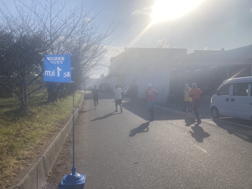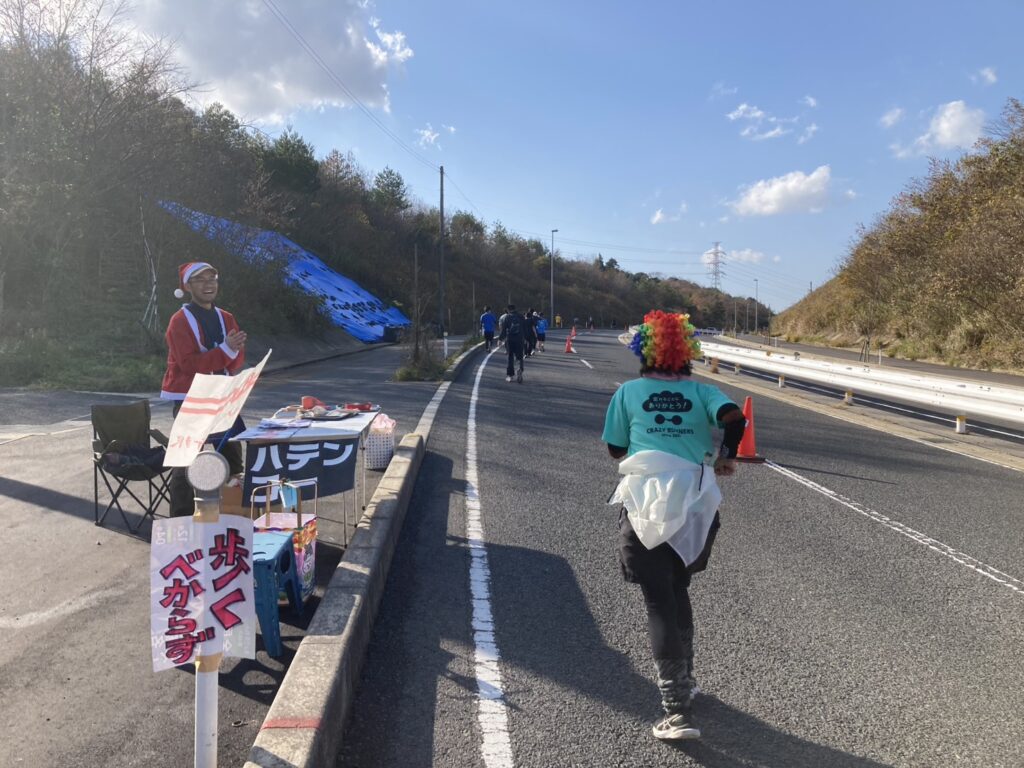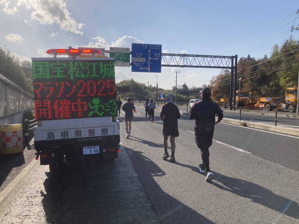 そんなことを思いながら進み、30.3kmの第7エイドに到着。ここでは宍道湖名産のしじみを使った「しじみ汁」は振舞われるはずでしたが、予想どおり売り切れ。ただ、食べ物が少しだけ残っていて、初めての給食をします。道の駅本庄、弁慶海道と進み、この先は海を離れて内陸を進むので、風が少し治まります。35km地点を通過して、国道431号線をゴール目指して進んみます。この先、大きな上り下りが2回ありますが、風が治まってだいぶ楽です。上り坂の途中に、私設エイド(私が見る限り唯一の私設エイド)があって応援してくれます。38.7km地点の第6関門を16分前に通過。この間、だいぶ走ったので時間に少し余裕があります。