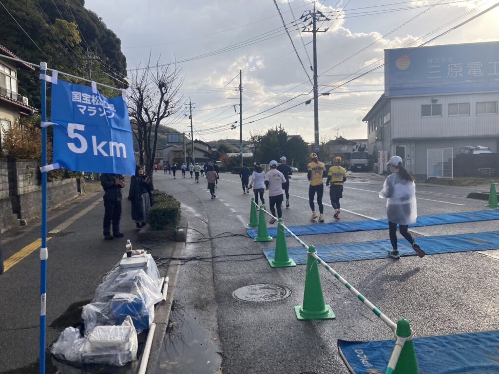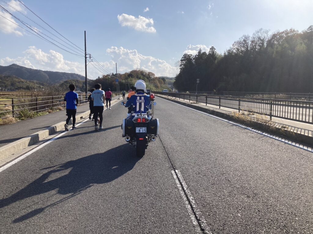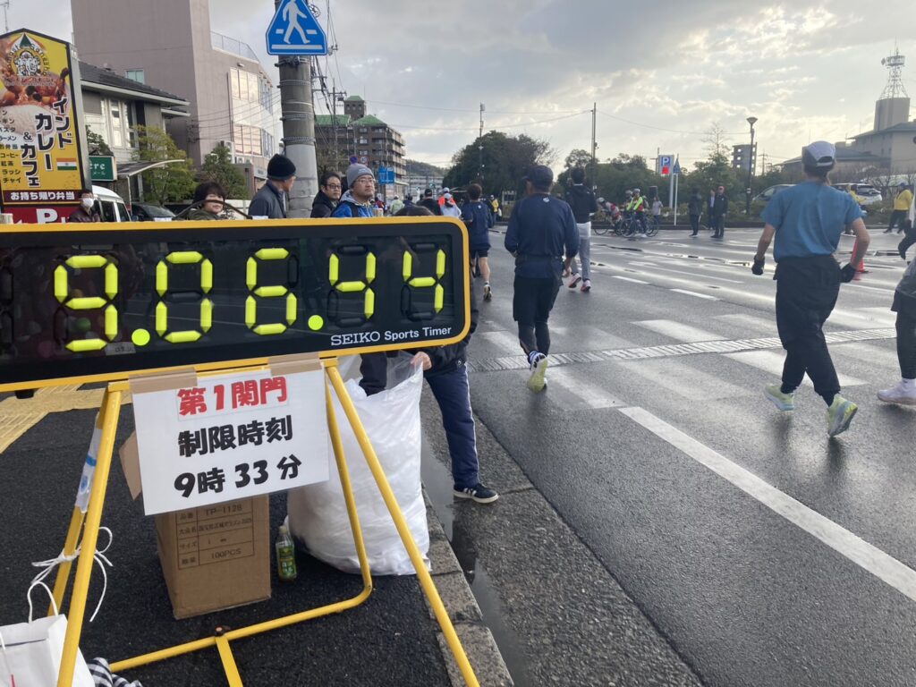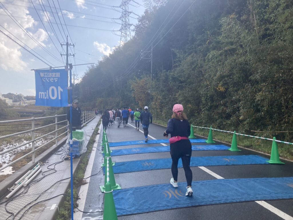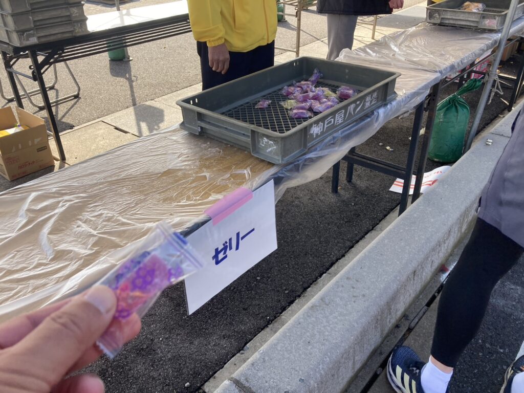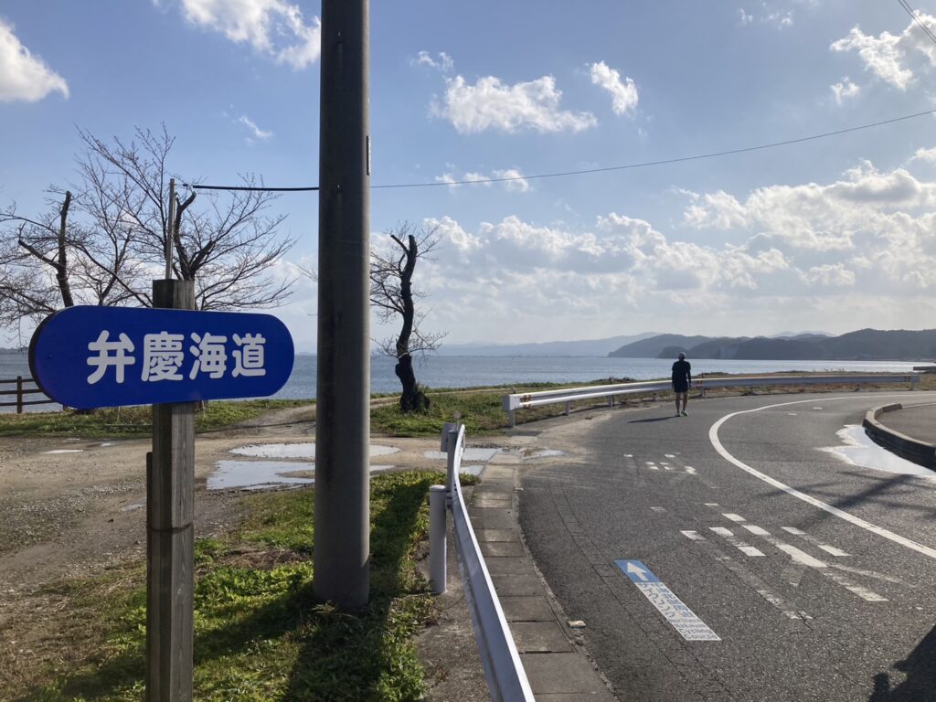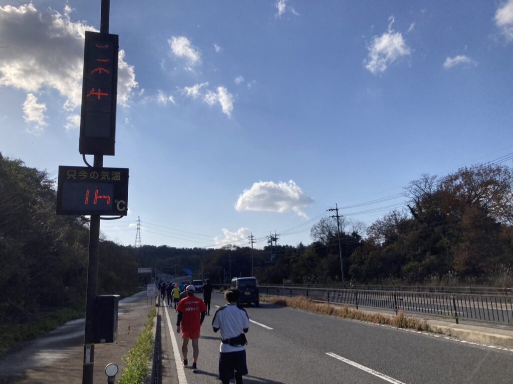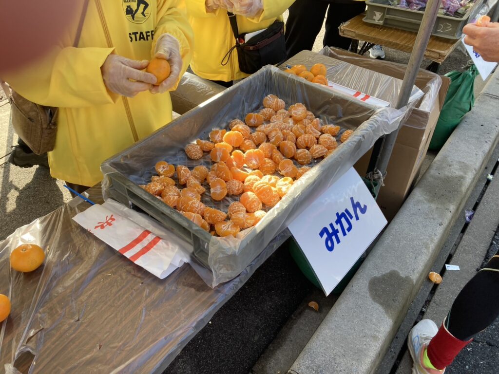 そんなことを思いながら進み、30.3kmの第7エイドに到着。ここでは宍道湖名産のしじみを使った「しじみ汁」は振舞われるはずでしたが、予想どおり売り切れ。ただ、食べ物が少しだけ残っていて、初めての給食をします。道の駅本庄、弁慶海道と進み、この先は海を離れて内陸を進むので、風が少し治まります。35km地点を通過して、国道431号線をゴール目指して進んみます。この先、大きな上り下りが2回ありますが、風が治まってだいぶ楽です。上り坂の途中に、私設エイド(私が見る限り唯一の私設エイド)があって応援してくれます。38.7km地点の第6関門を16分前に通過。この間、だいぶ走ったので時間に少し余裕があります。