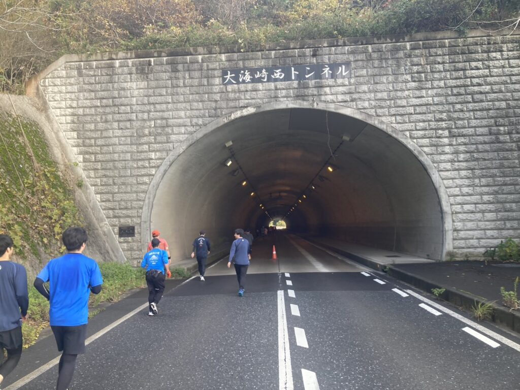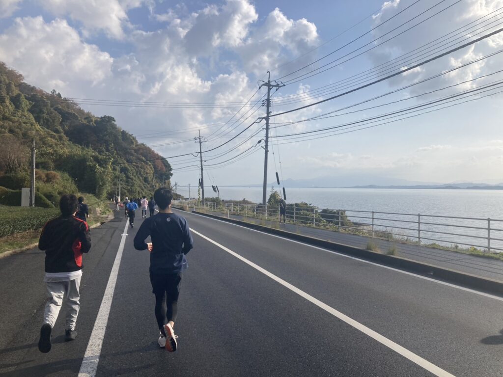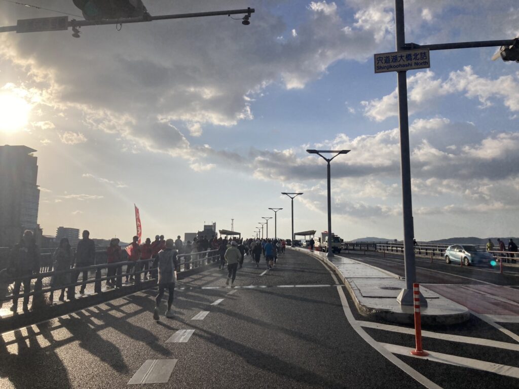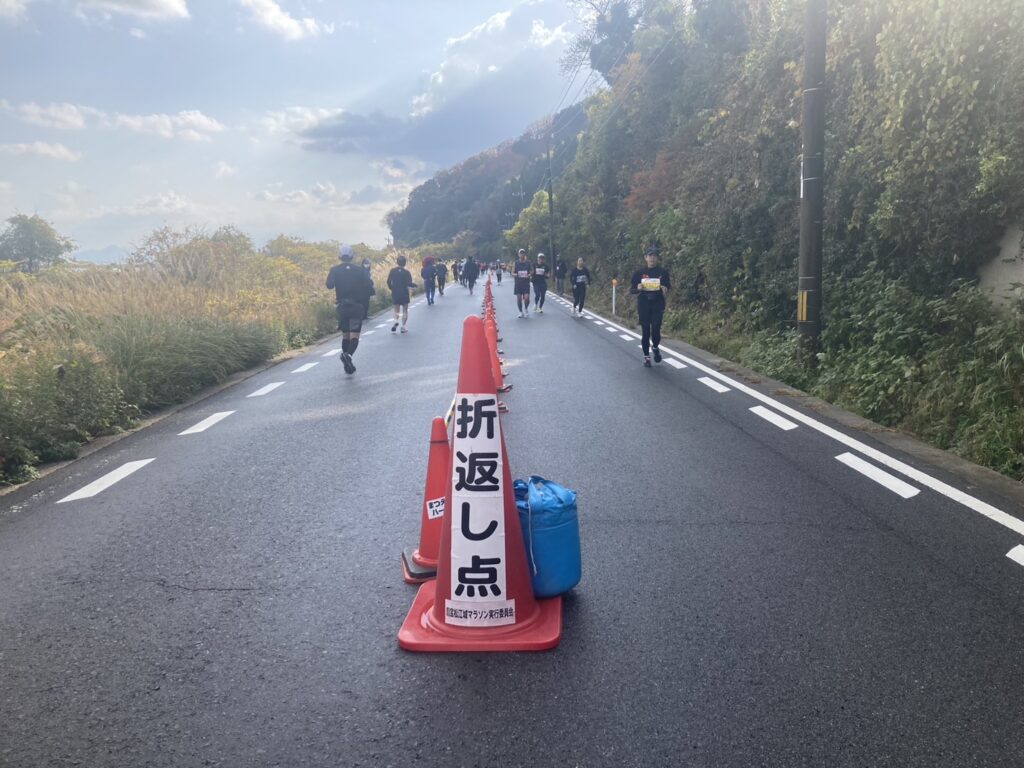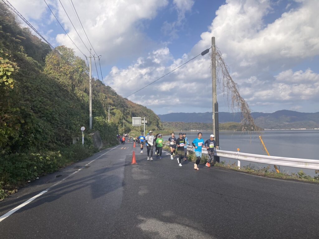 エイドを通過して、上り坂を上り10km地点、第2関門を通過していきます。下り坂を下っていくと中海が見えてきます。大海崎西トンネルをくぐり、第3関門を通過。14km付近からはコースで唯一のすれ違いポイントになり、折り返してくるランナーとエールを交わしながら進みます。折り返し地点で折り返して、間もなく15km地点を通過。来た道を戻って行き、左折して大海崎橋を渡って大根島に入ります。