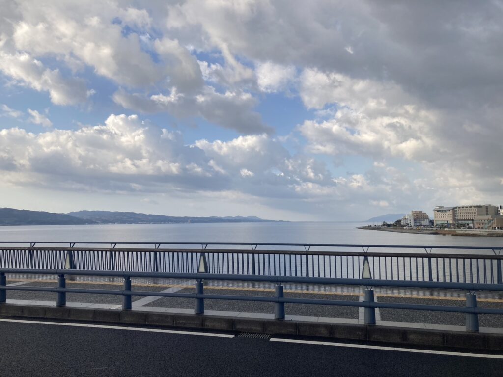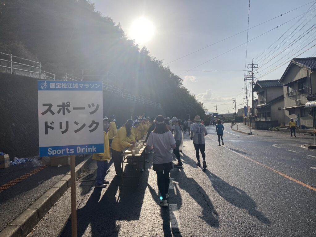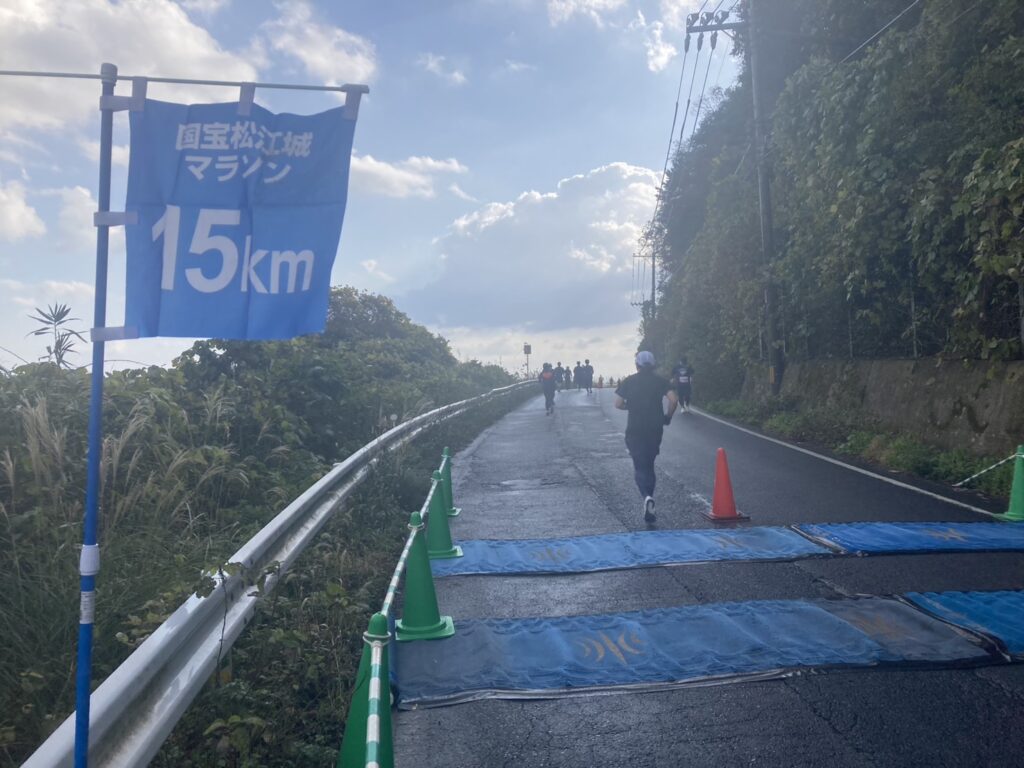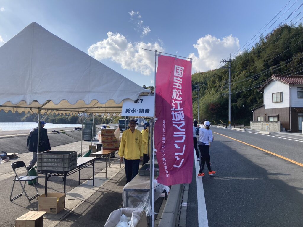 スタートして、最初は松江の市街地を走っていきます。市街地なのですが、応援の人が少ないです。ちょっと走ると、遠くに松江城が見えてきます。大会名が「国宝松江城マラソン」なので松江城は必須なのですが、遠くにちょっとだけ見えるだけです。松江城を通過して、宍道湖大橋、くにびき大橋と渡って、一度スタート地点近くに戻ってきて、そこから中海方面へ進んで行きます。4.5km地点の第1関門を無事に通過。この大会の関門は、完走ギリギリの時間で設定されているので、前半の関門は余裕をもって通過していかないと、後半の関門に間に合わなくなります。朝は小雨が降ってましたが、日が差してきて、気温が上がってきたので、しっかり給水を取りながら進みます。9.8km地点のエイドでは給水と給食ができるはずでしたが、給食のバナナなどはすでに売り切れ状態で何もありません。このときはまだ前半だったので、そんな問題ではないのですが、この先、行けども行けども給食が売り切れていて、補給ができないまま走ることになります。