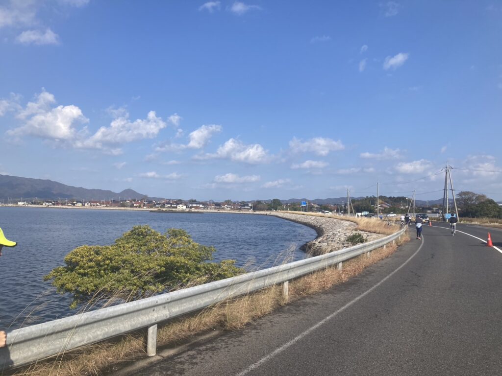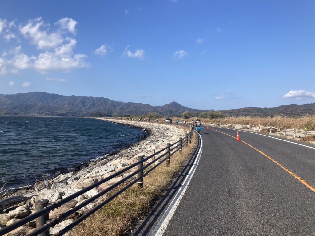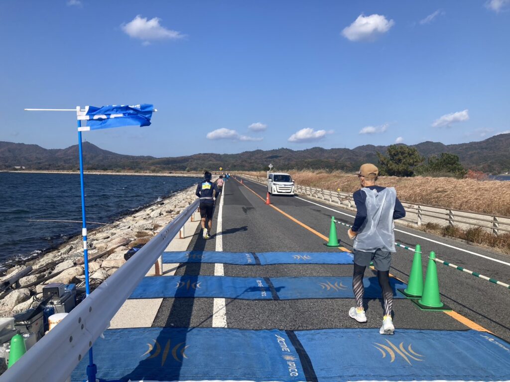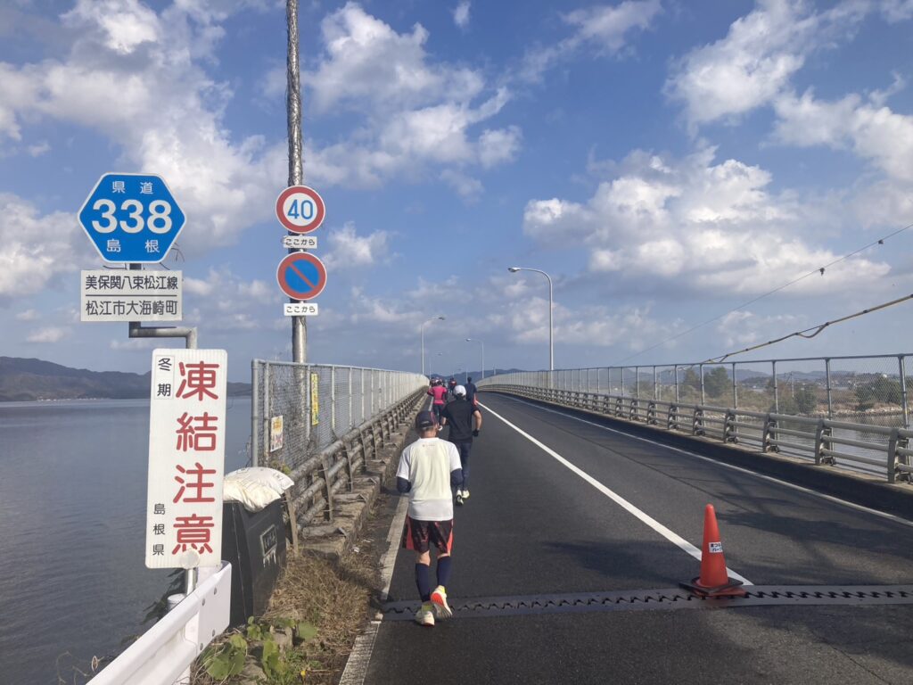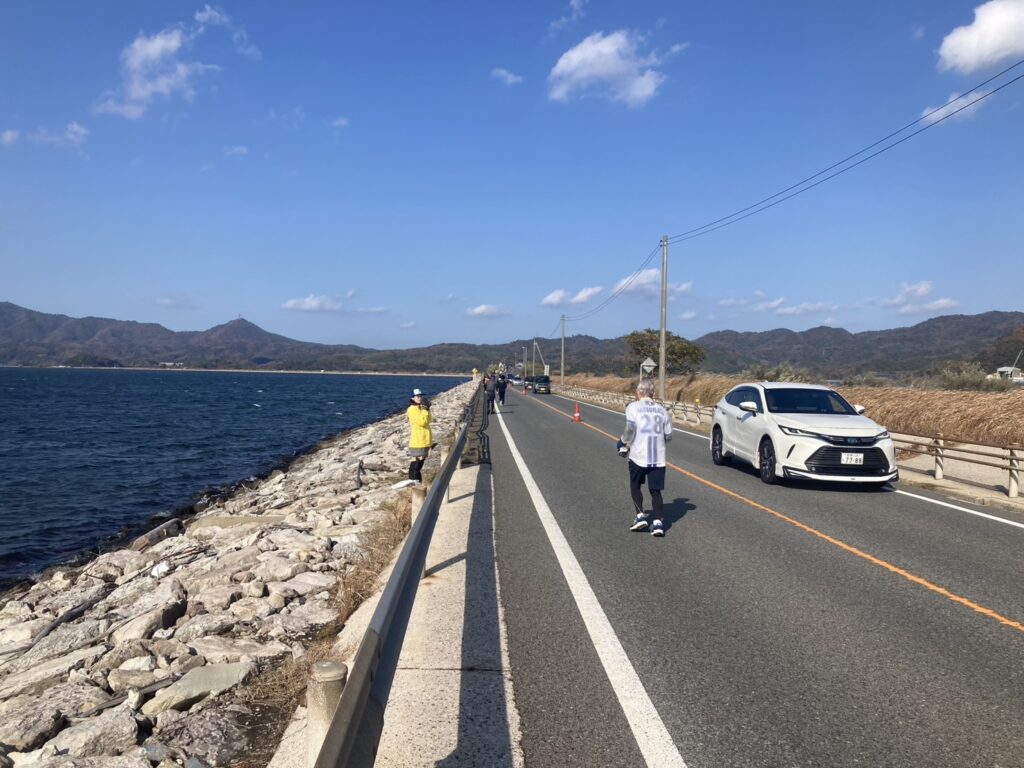 大根島は中海に浮かぶ島でとても景色がいいです。20km地点を通過して、その先の仮設トイレに寄ります。トイレも景色がいい場所に設置されてます。間もなく中間点を通過。時間的にはとても順調ですが、この辺りまでくると、すでにきつくなっているランナーが歩いてます。大根島から江島に渡ると、コースの右側にCMで有名になった「べた踏み坂」の江島大橋が見えます。23.9km地点の第4関門を通過し、この先は砂嘴の上を通る県道338号線を進みます。両側が海なので、走るのが困難なほどのすごい強風が吹いてます。そんな強風の中を約3km進み、26.8km地点の第6エイドに到着。ここでも給食は売り切れていて、飲み物しかありません。私は大丈夫ですが、他のランナーはエネルギーが切れて、ガス欠状態になったり、お腹が空いて気力がなくなってしまってます。遅いランナーほど補給が必要なのに、エイドで補給物がないというのは運営的に大きな問題です。とはいえ、今、そんなことを言っていても仕方ないので、そんなランナー達を励ましながら、一緒にゴールを目指して進みます。