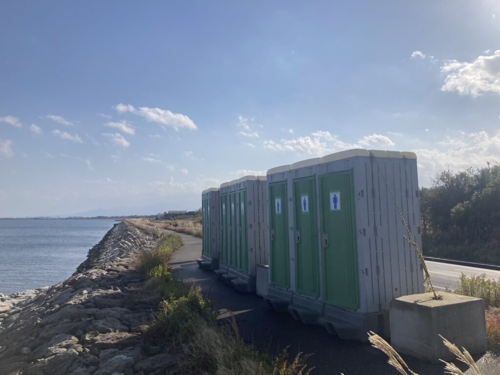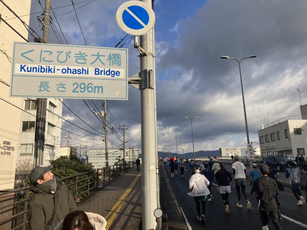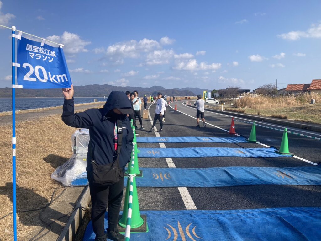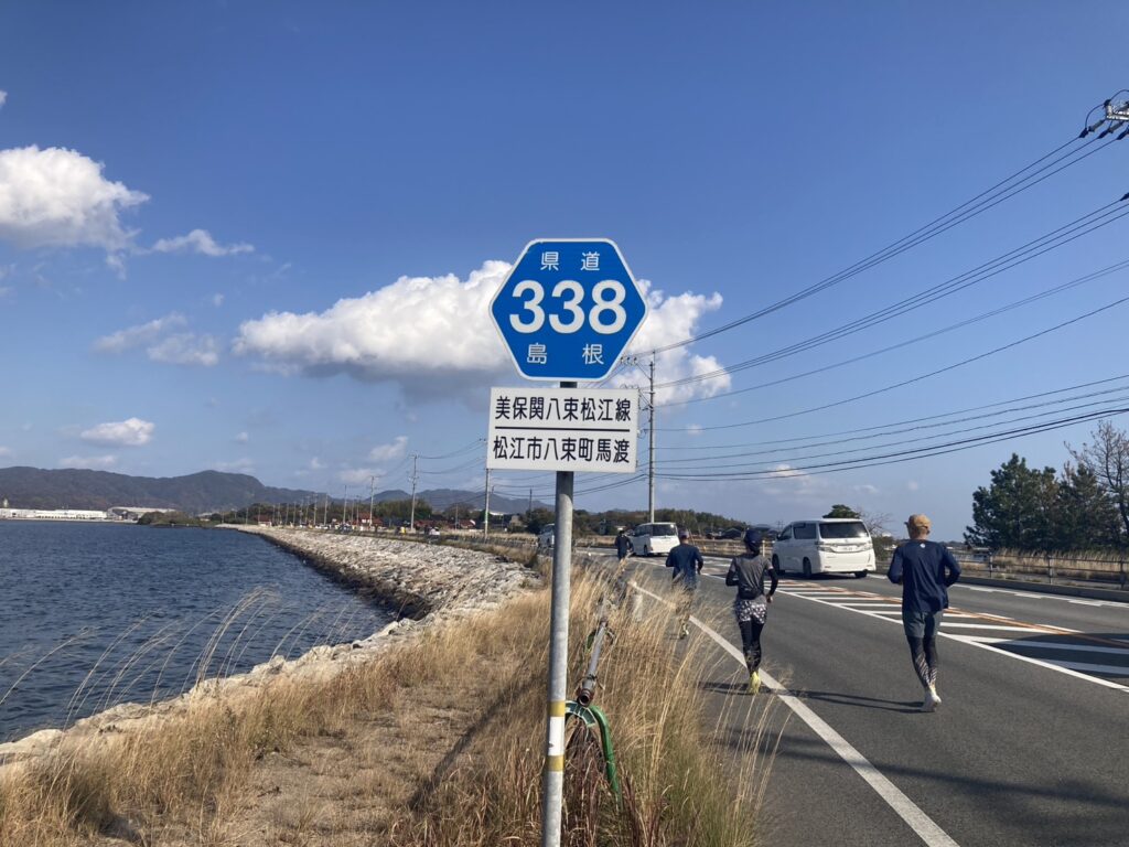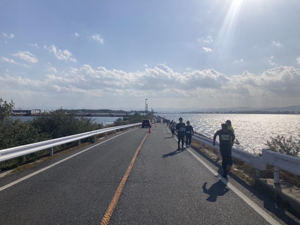大根島は中海に浮かぶ島でとても景色がいいです。20km地点を通過して、その先の仮設トイレに寄ります。トイレも景色がいい場所に設置されてます。間もなく中間点を通過。時間的にはとても順調ですが、この辺りまでくると、すでにきつくなっているランナーが歩いてます。大根島から江島に渡ると、コースの右側にCMで有名になった「べた踏み坂」の江島大橋が見えます。23.9km地点の第4関門を通過し、この先は砂嘴の上を通る県道338号線を進みます。両側が海なので、走るのが困難なほどのすごい強風が吹いてます。そんな強風の中を約3km進み、26.8km地点の第6エイドに到着。ここでも給食は売り切れていて、飲み物しかありません。私は大丈夫ですが、他のランナーはエネルギーが切れて、ガス欠状態になったり、お腹が空いて気力がなくなってしまってます。遅いランナーほど補給が必要なのに、エイドで補給物がないというのは運営的に大きな問題です。とはいえ、今、そんなことを言っていても仕方ないので、そんなランナー達を励ましながら、一緒にゴールを目指して進みます。