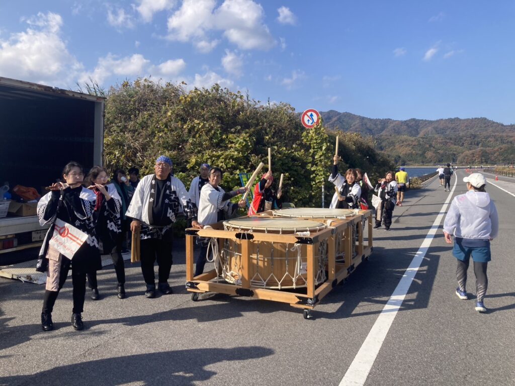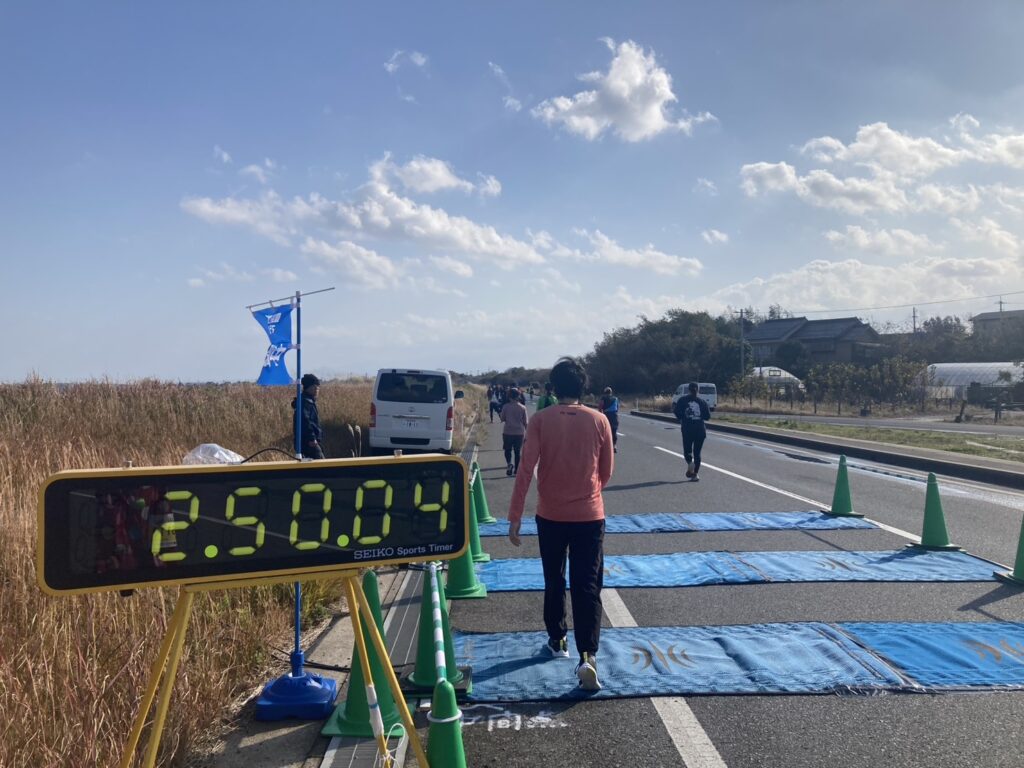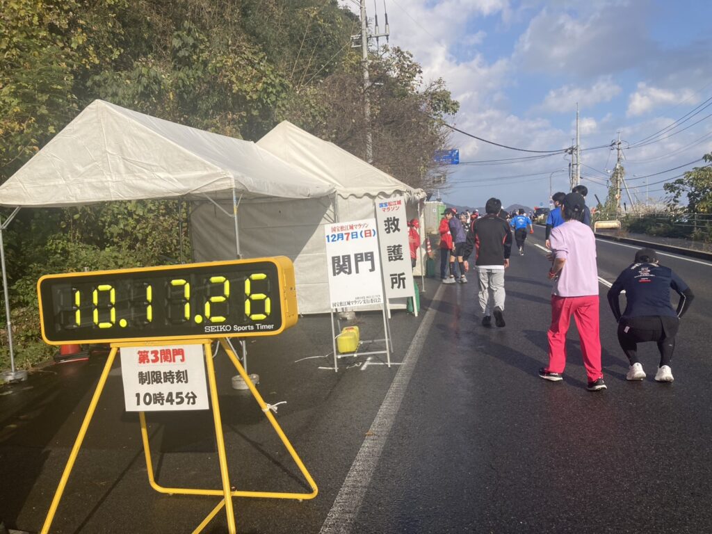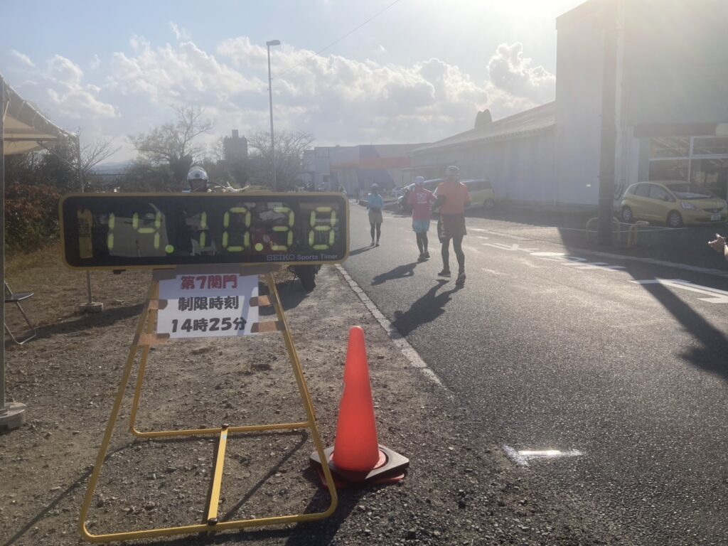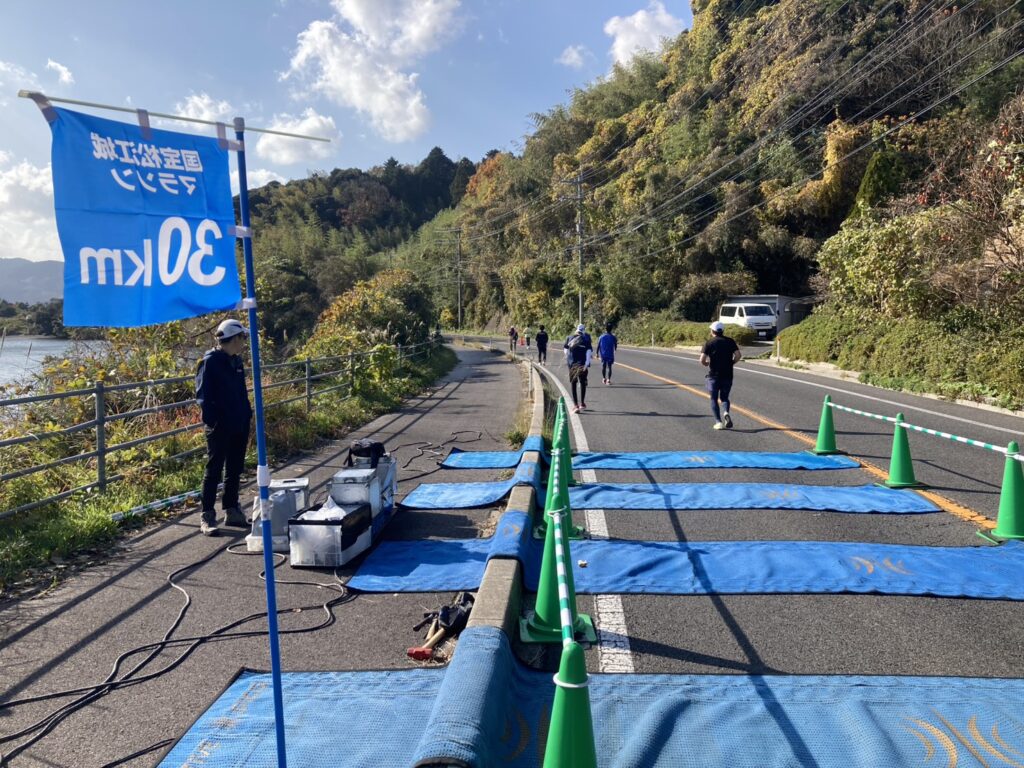 この大会は応援の人が少ないのですが、途中で地元の太鼓団体が応援してくれてます。威勢のいい声援を受け、先に進み、28.3kmの第5関門を通過。4分16秒前に通過しましたが、先ほども書いたとおり、この大会は途中の関門ギリギリだと最後は間に合わなくなってしますので、時間的にはそんなに余裕がない状況です。なので時計を確認しながら、走ったり歩いたりしながら進みます。進んでいると後方から救急車がきたので、ランナーはみんな左に寄ってコースを開けます。その先の救護所で倒れてランナーがいて救護されてました。しばらく走って30km地点を通過。応援はいないし、強風は吹くし、食べ物は無いし、関門時間は迫っているし、走力のないランナーは走る気力がなくなり、完走をあきらめてDNFを選択する人が増えてきます。なんとかゴールをさせてあげたいのですが、走る気力がないのではどうしようもないです。
