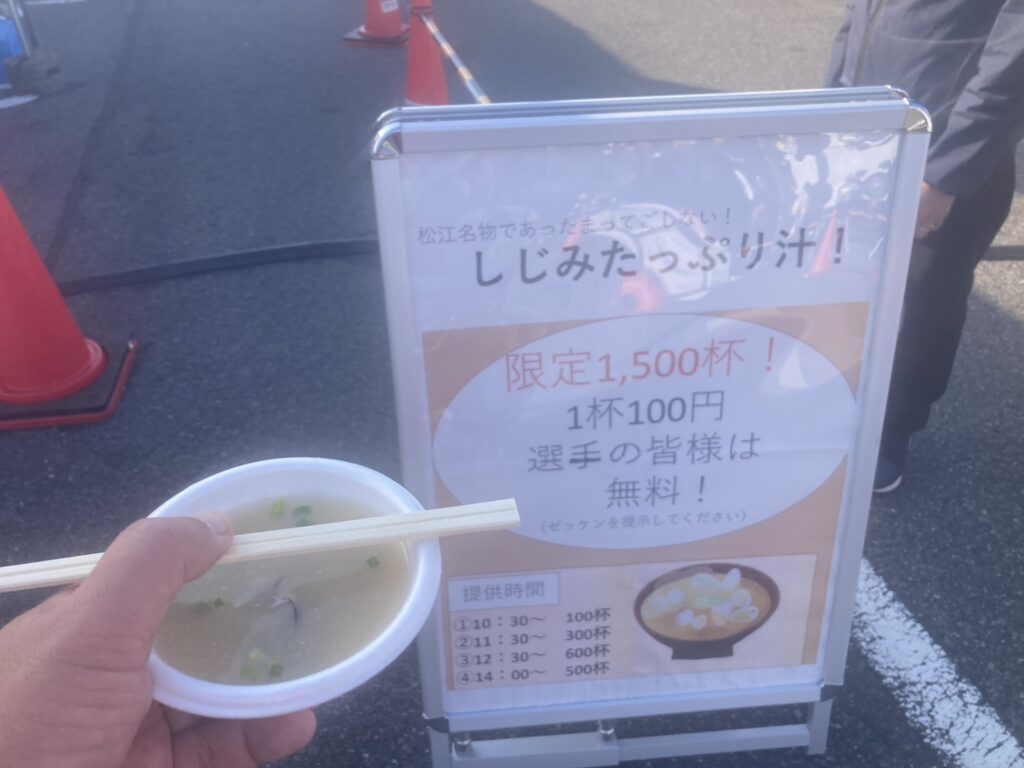 ゴールして、チップを取ってもらい、フィニッシャータオルをかけてもらい、完走メダルをもらって、最近の大会では珍しく、その場で記録証をもらって、途中のエイドでは食べられなかった「しじみ汁」をいただきました。その後、荷物を受け取り、着替えて、車でスーパー銭湯に行って汗を流しました。