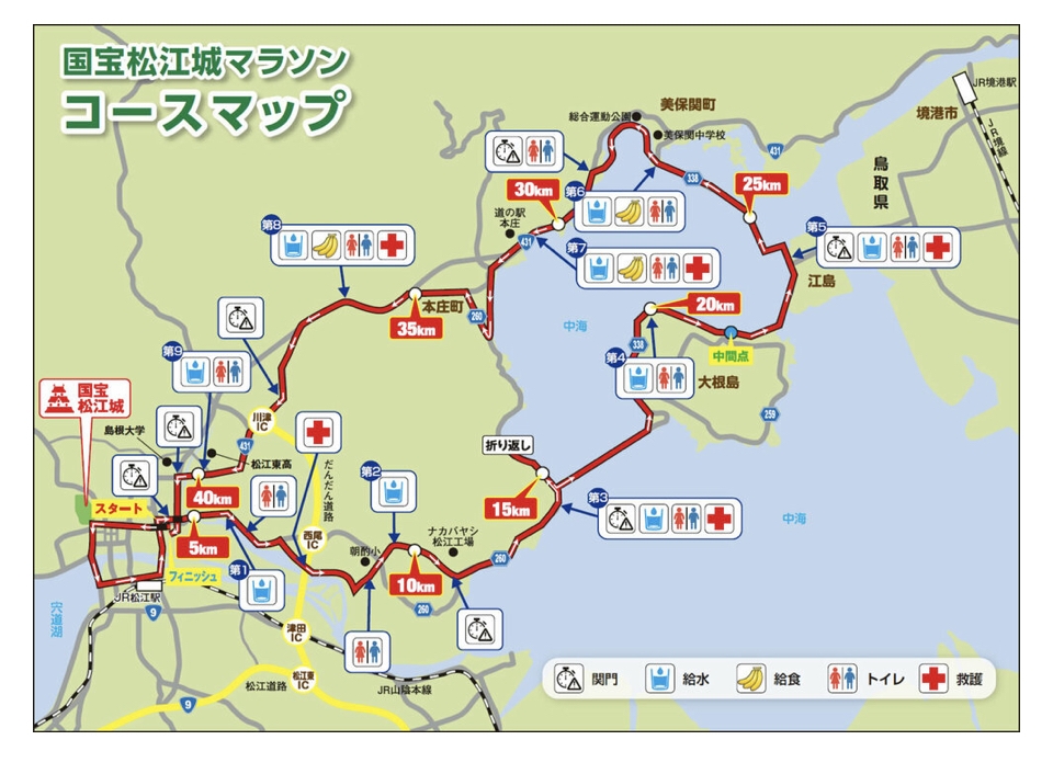 今回はお天気は良かったですが、途中の強風は予想以上の強さで大変でした。エイドの食べ物がぜんぜん無いのは、完走を目指すランナーにとっては致命傷になることなので、しっかりと検討してほしいところです。田舎なので応援が少ないのは仕方がないことですが、大会側で何か工夫ができないかと思います。島根県唯一のフルマラソンと言うことで、全都道府県制覇を目指すランナーは参加するのでしょうが、そういうランナーは全国の大会を走っているので、他の大会に比べると、きっと物足りなさを感じていることでしょう。とはいえ、島根県・松江を多くのランナーと一緒に走れたのは、とても有意義な時間でした。