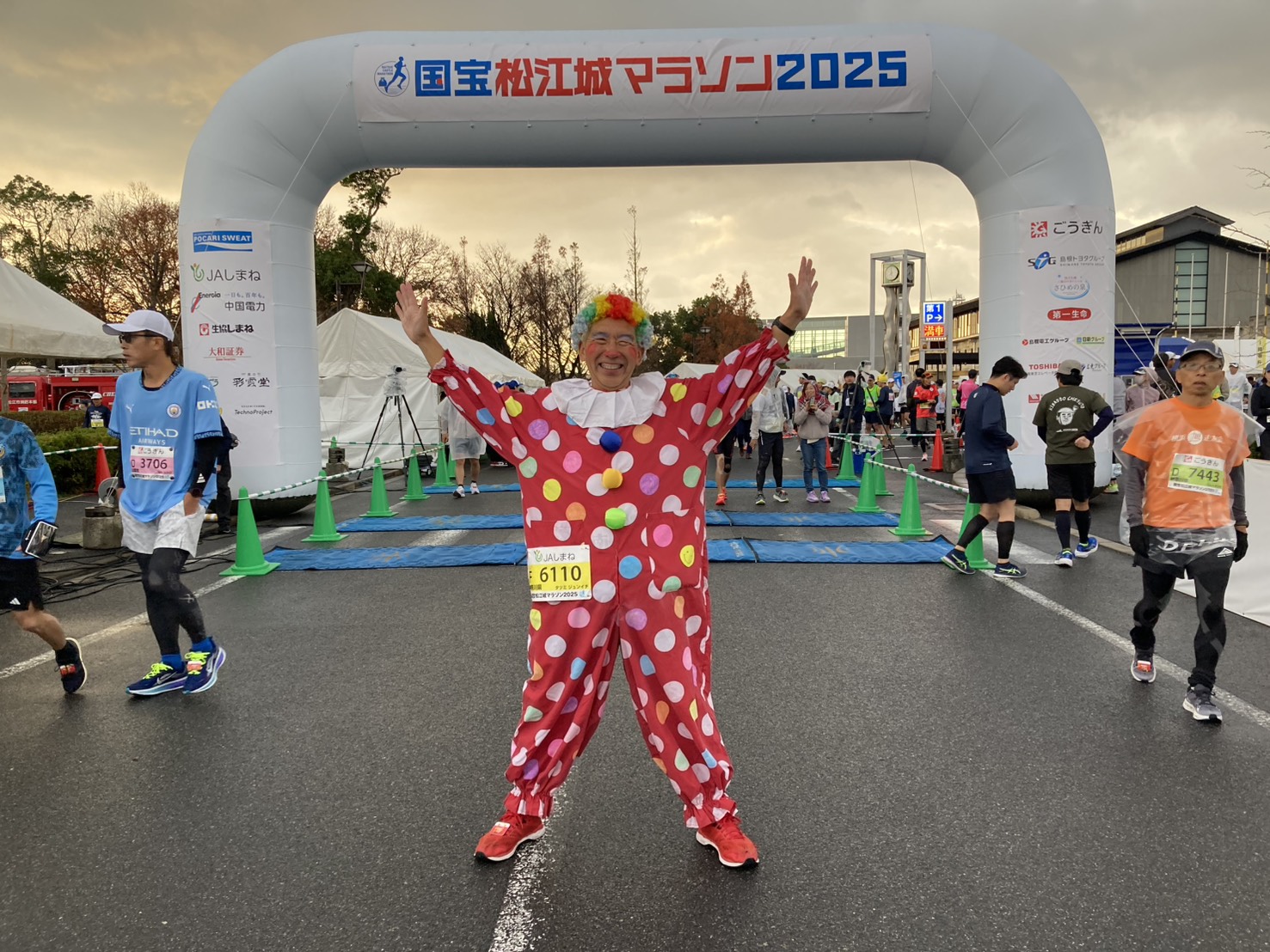 車中泊していた松江駅近くのコインパーキングから徒歩で会場の松江市総合体育館に向かいます。徒歩で約10分、会場の松江市総合体育館に着くとすでの多くのランナーが集まってます。フルマラソンの参加者は4597人と中規模な大会なので、会場内は混んでます。スタート前に小雨が降ってきて、みんな屋根のある所で雨をしのいでましたが、スタートの頃には止んでくれました。今回は制限時間が6時間なので、いつもどおりピエロの仮装をして、景色とエイドを楽しみながら走ります。スタートの時には雨は止んでお天気も良く、絶好のマラソン日和ですが、海沿いを走るので風が強そうです。スタート15分前の8時15分になって、道路規制が始まり、ランナーは各自スタートブロックに整列してスタートを待ちます。私はいつもどおり最後尾からスタートするので、最後尾でスタートを待ちます。周りのランナーと話をしながら待っていると、スタート時間の8時30分になり、号砲が鳴りスタート。最後尾の私は約5分後にスタートラインを通過して走り始めました。