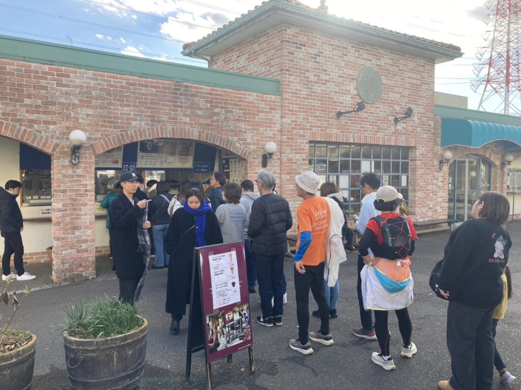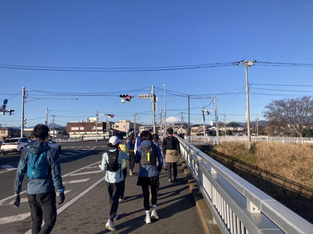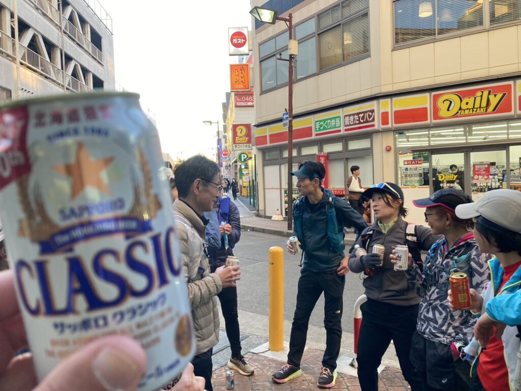 ご飯を食べ終えてリスタート、みんなで一緒に進んでいきます。広く畑が広がる風景の中を進み、歩道橋で小田原厚木道路を渡って、柏木牧場に立ち寄ります。牛肉メンチとソフトクリームが美味しいと評判な牧場で、みんな食べに来ていて長蛇の列になってます。ここからゴールの平塚駅までは約10kmなので、歩いていても明るいうちに到着できそうなのですが、みんな走ります。ペースが速いので着いて行けず、みんなより少し遅れて平塚駅に到着して、感動のゴルゴルゴール。タイムは8時間13分01秒と例年よりだいぶ早いタイムでゴールしました。ゴール後はとりあえず缶ビールで乾杯し、その後、お店に移動して新年会となりました。