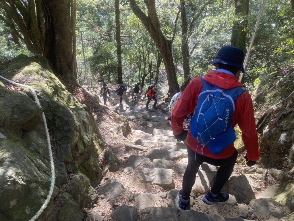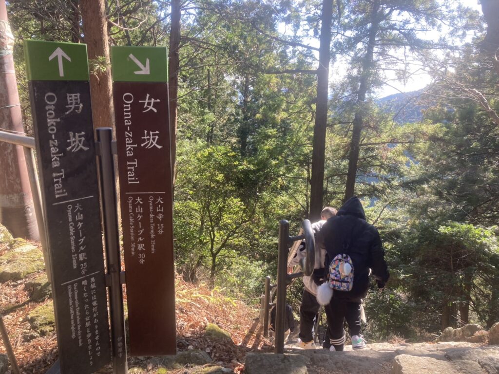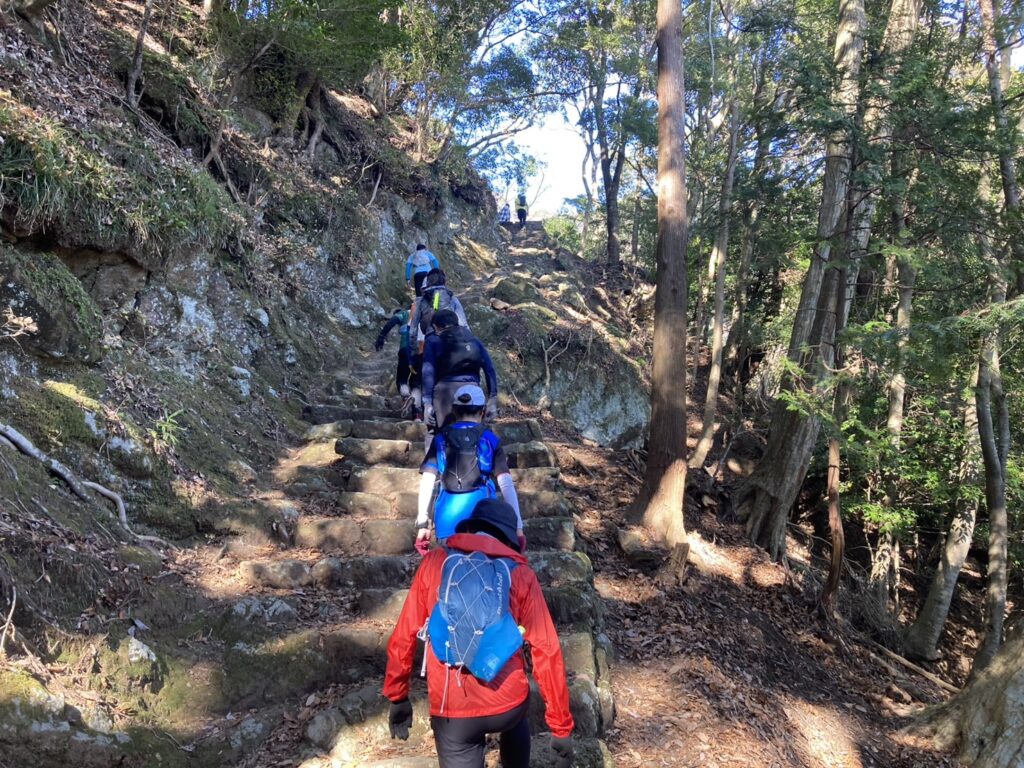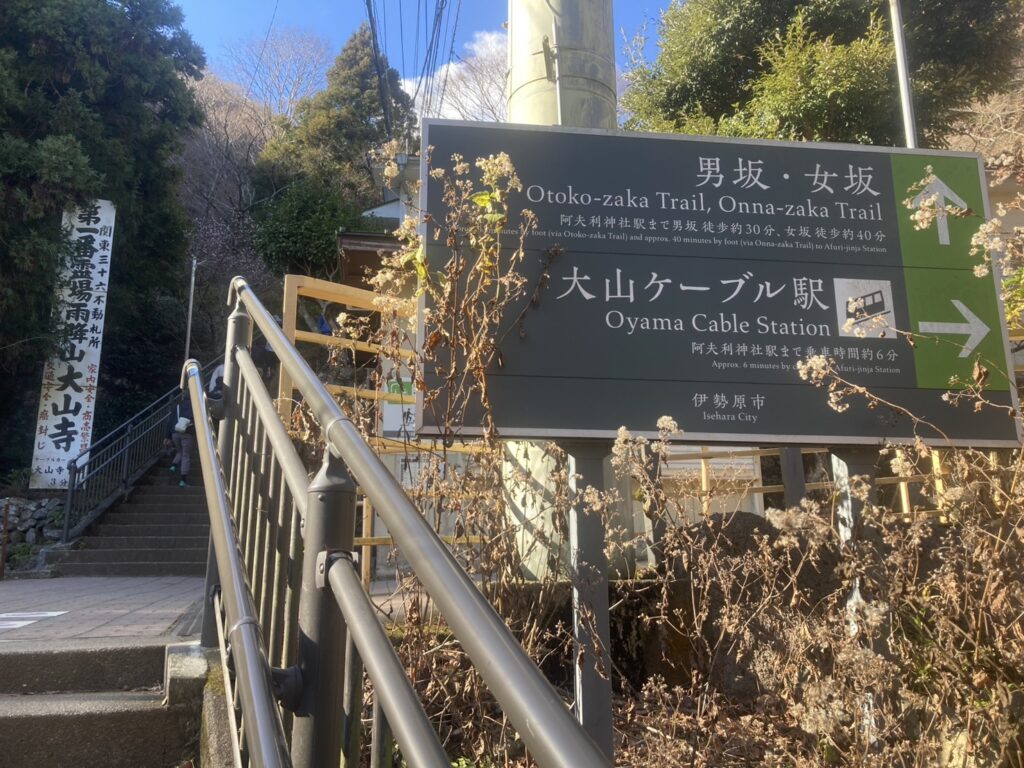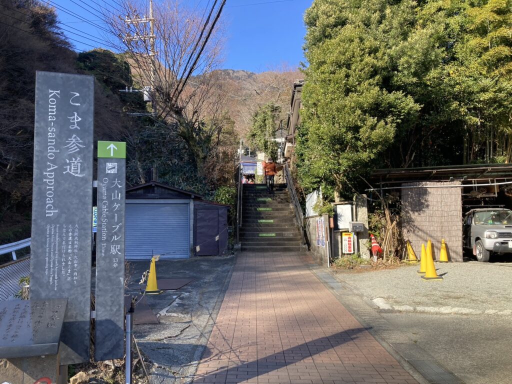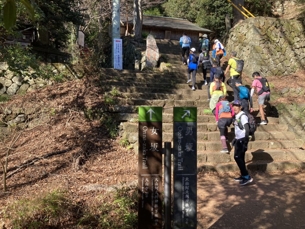 この先は大山に向かって上りになっていきます。途中、子易明神比比多神社に寄ってお参りをして、上りが続くので走らず歩いて進みます。二の鳥居をくぐって、鈴川に沿って進み、丹沢大山国定公園のゲートをくぐると、上り坂の傾斜が急になってきます。しばらく上って行くとバスの終着点に到着。車で行けるのはここまでなので、この先は観光客もみんな歩いて上って行きます。こま参道と呼ばれるお土産屋が並んでいる階段を上り、ケーブルカー乗り場に到着。観光客のほとんどは、ここからケーブルカーに乗って阿夫利神社下社に行くのですが、私たちはケーブルカーには乗らずに歩いて登っていきます。男坂と女坂の二つの登山道があるのですが、上りは急な男坂を登っていきます。本格的な山道を息を切らしながら休み休み登っていきます。登り始めてから約30分、阿夫利神社下社に到着。下社にはケーブルカーで上ってきた観光客がたくさんいて、にぎわってます。