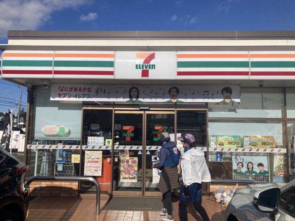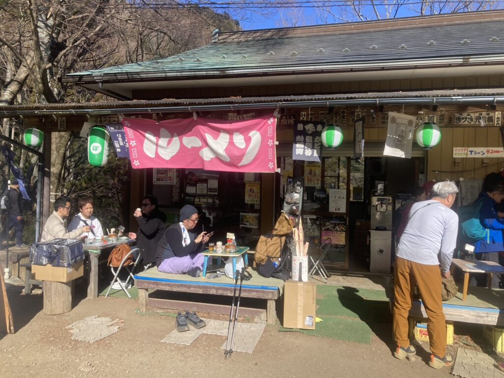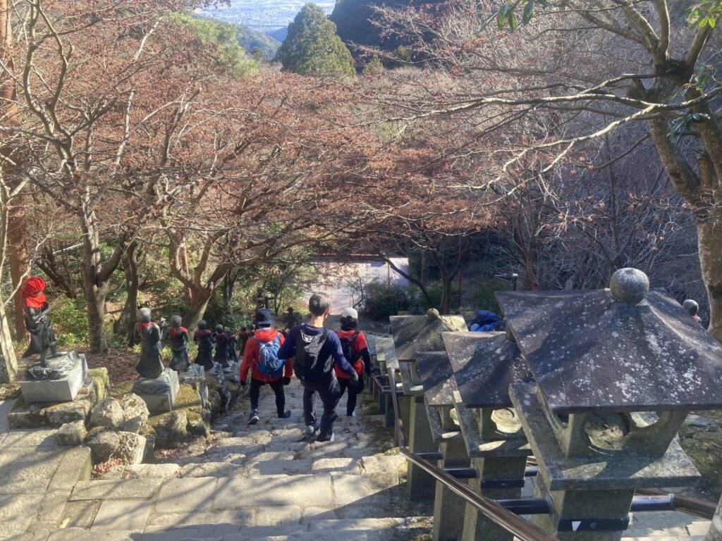 阿夫利神社下社でお参りをして、延命水を飲んで、みんなで記念撮影をして、山道を下っていきます。下りは女坂を下っていきます。女坂は男坂よりは傾斜はゆるやかですが、コケないようにゆっくり慎重に下っていきます。途中、大山寺をとおり、ケーブルカー乗り場まで下りてきました。観光客でにぎわうこま参道をとおり、バスの終着点まで戻ってきました。ここからは車も通る道なので、走って下っていきます。下りきって、最初のコンビニでお昼ご飯にしました。