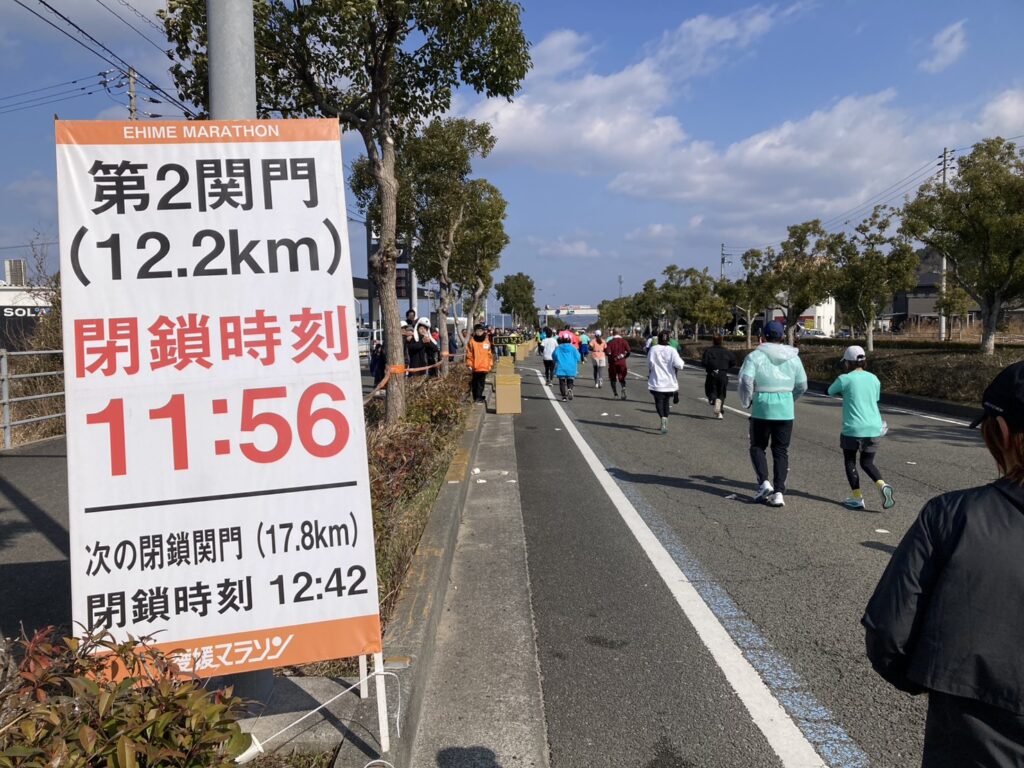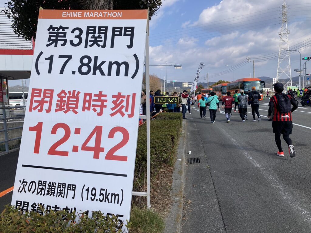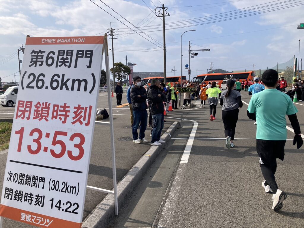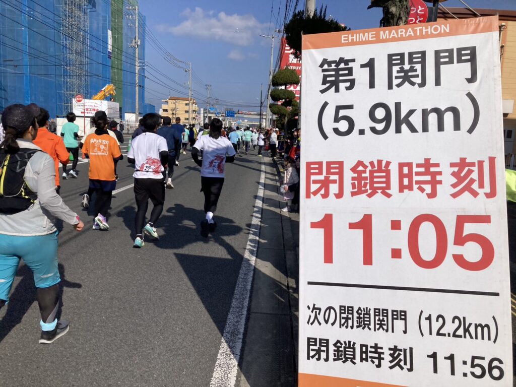 スタートしてすぐのところには、松山市内を走る「坊ちゃん列車」が停車してます。しばらくは市街地を走っていくのですが、すごい数の人が沿道で声援をしてくれていて、その中を走っていきます。スタート時間のロスタイムがあるので第1関門の閉鎖時間には気を付けなければなりません。時計を確認しながら進み、5.9km地点の第1関門を無事に通過。この後の関門も1kmを約8分30秒ペースで設定されているので、前半の関門はある程度の余裕をもって通過していかないと、後半の関門を通過できなくなってしまいます。