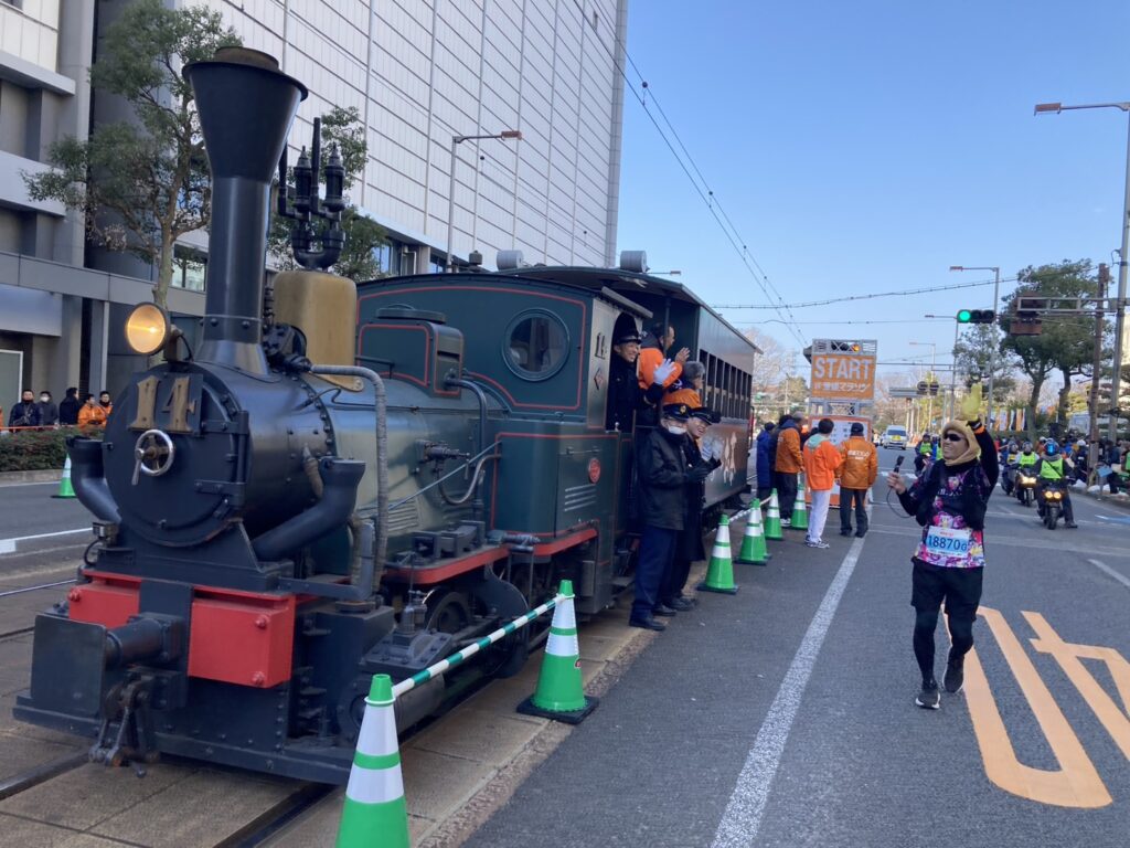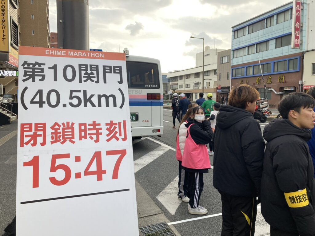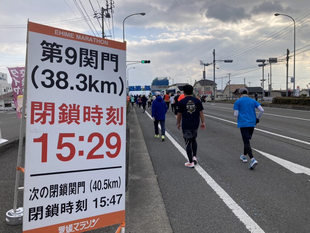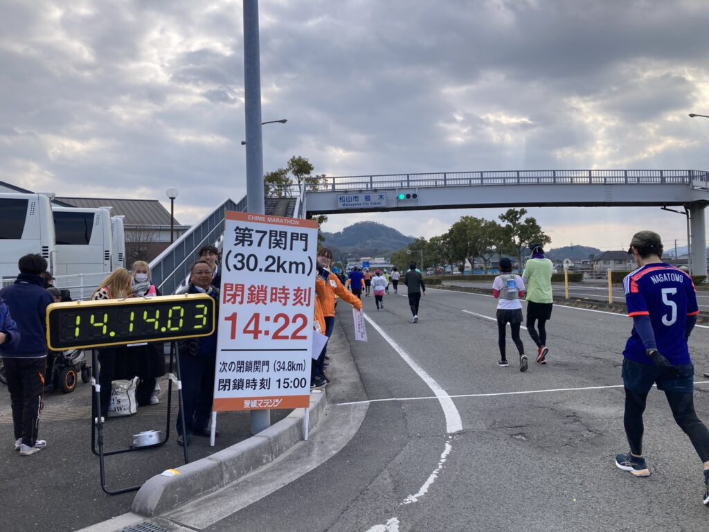 スタートしてすぐのところには、松山市内を走る「坊ちゃん列車」が停車してます。しばらくは市街地を走っていくのですが、すごい数の人が沿道で声援をしてくれていて、その中を走っていきます。スタート時間のロスタイムがあるので第1関門の閉鎖時間には気を付けなければなりません。時計を確認しながら進み、5.9km地点の第1関門を無事に通過。この後の関門も1kmを約8分30秒ペースで設定されているので、前半の関門はある程度の余裕をもって通過していかないと、後半の関門を通過できなくなってしまいます。