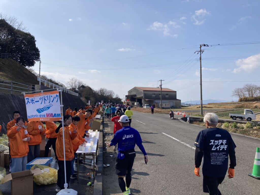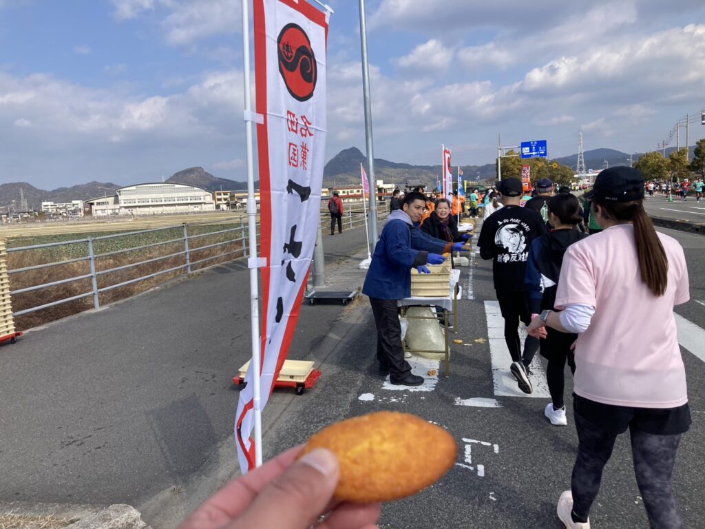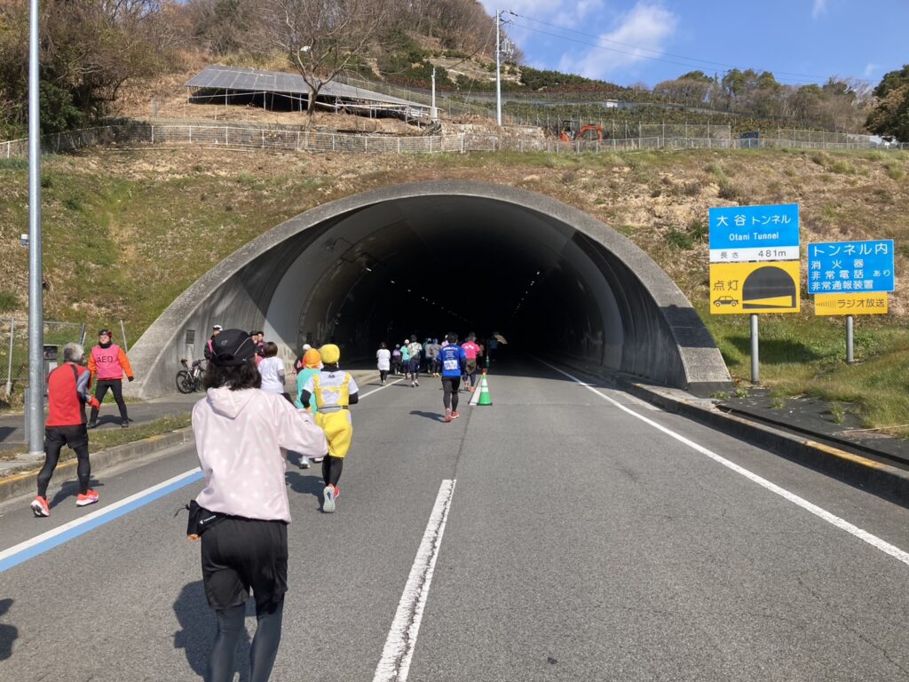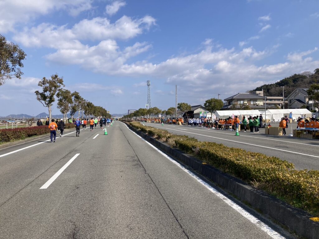 第1関門を通過してしばらく進むと、長い上り坂になります。まだ前半ですが歩いているランナーが多いです。坂を上りきると左側に瀬戸内海が見えてきます。トンネルを2つ通過してしばらく行くと12.2km地点の第2関門です。関門を通過して、トイレに寄って、お接待エイドでコンソメスープをいただきます。エイドを出ると、折り返してきたトップランナーの集団が前方から来ました。さすがに速いです。この辺りからは、だんだん市街地を外れていくので、沿道の応援も減ってきます。とはいえ、今まで参加した他の大会に比べると多くの人が沿道で応援してくれてます。エイドでもすごい人数の学生たちが大声援を送ってくれます。17.5km地点のエイドでは、地元の銘菓・一六のマドレーヌをいただき、17.8kmの第3関門を7分前に通過します。