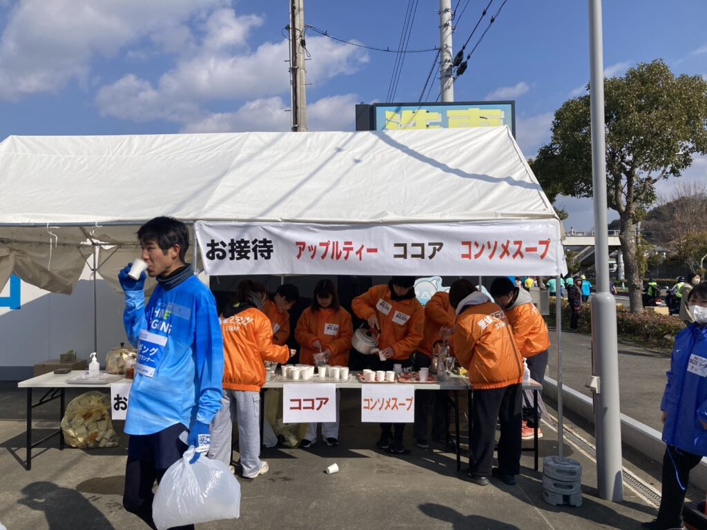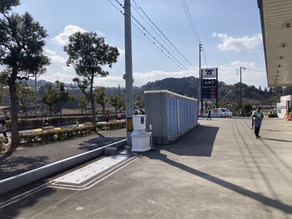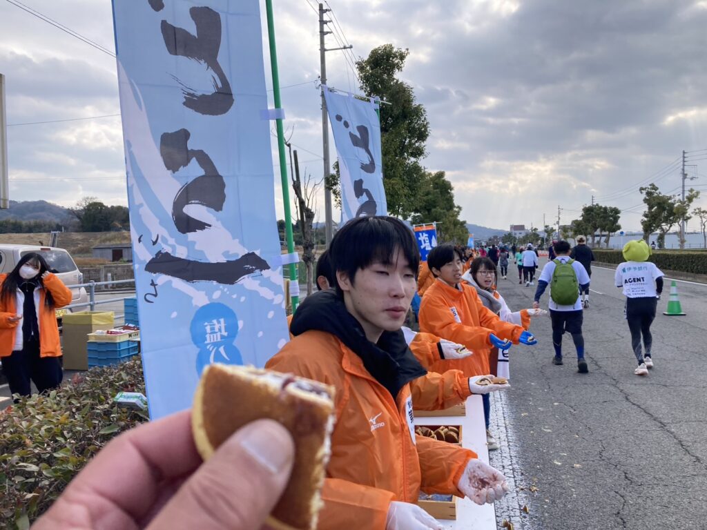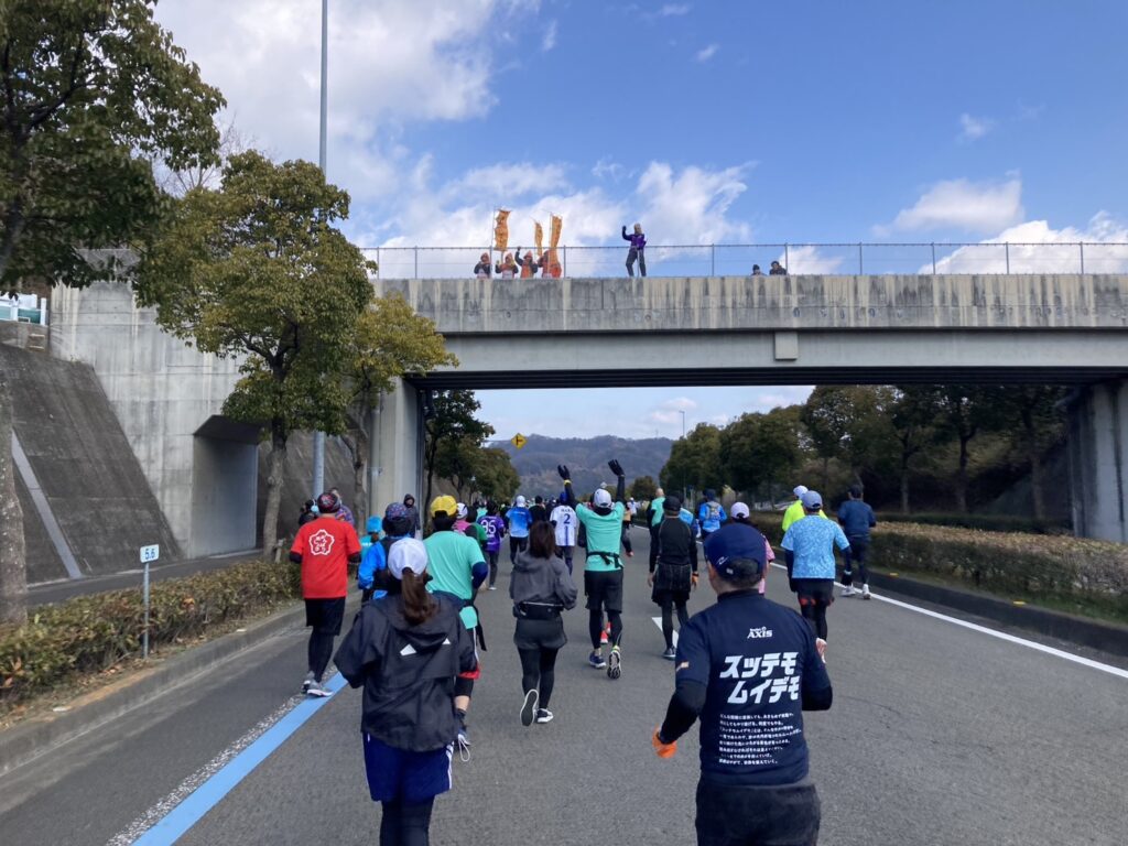 第1関門を通過してしばらく進むと、長い上り坂になります。まだ前半ですが歩いているランナーが多いです。坂を上りきると左側に瀬戸内海が見えてきます。トンネルを2つ通過してしばらく行くと12.2km地点の第2関門です。関門を通過して、トイレに寄って、お接待エイドでコンソメスープをいただきます。エイドを出ると、折り返してきたトップランナーの集団が前方から来ました。さすがに速いです。この辺りからは、だんだん市街地を外れていくので、沿道の応援も減ってきます。とはいえ、今まで参加した他の大会に比べると多くの人が沿道で応援してくれてます。エイドでもすごい人数の学生たちが大声援を送ってくれます。17.5km地点のエイドでは、地元の銘菓・一六のマドレーヌをいただき、17.8kmの第3関門を7分前に通過します。