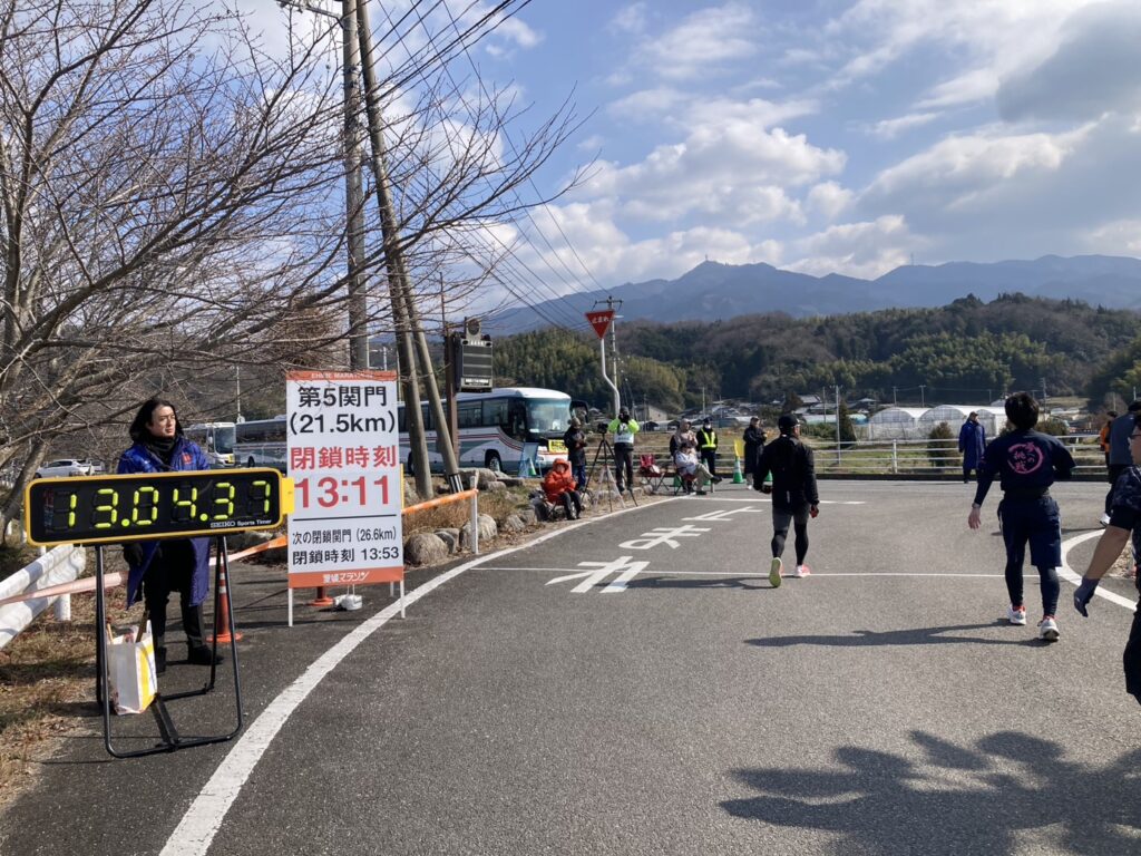 この先は景色が開けてはるか先を走るランナーまで見えます。19.5km地点の第4関門を通過して、しばらく走ると中間点です。中間点通過は3時間01分36秒。そのすぐ先にある21.5km地点の第5関門を通過。関門時間7分前ですが、6時間制限なので、この辺を走っているランナーは時間的にあまり余裕はありません。