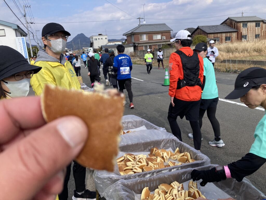 関門の先のエイドで給水をして、地元の銘菓・山田屋まんじゅうをいただきます。この先、往復約3kmの折返しコースです。折返しなのでランナー同士がすれ違うので、お互いにエールを送りながら進みます。折返し地点まで行って折返すと、帰りは自分より後方のランナーとすれ違うのですが、みんなすでに歩いてます。この辺で歩いていては、次の関門時間には間に合いません。25.5kmのエイドではどら焼きをいただきます。甘くて美味しいです。最後尾のランナーとすれ違い、26.6km地点の第6関門を8分前に通過。関門時間が1km8分30秒に設定されているので、走れているランナーは関門を通過できますが、歩いているランナーは間に合わなくなってきてます。
