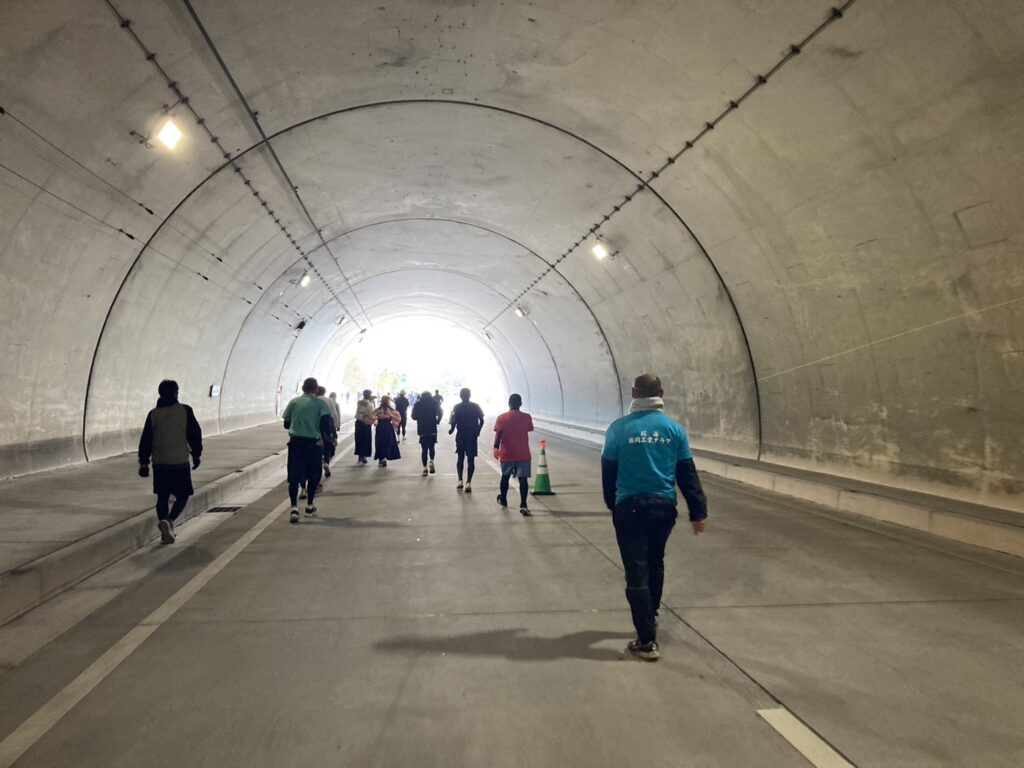 この先は走ってきたコースを市街地に向かって戻って行きます。周りのランナーはみんなキツそうなので、声をかけながら進みます。3kmごとにあるエイドでは、多くの学生たちが声を出して給水、給食をしてくれます。30.2km地点の第7関門を8分前に通過。私はゴール関門ギリギリの1km8分30秒で走ってますが、ほとんどのランナーは歩いてしまってます。限界を越してしまい救急車で搬送されているランナーもいます。長い国道を走って、トンネルを通過すると、地元の高校生の応援団が大声援を送ってくれます。34.8km地点の第8関門を7分前に通過。コールドスプレーエイドでは、多くのランナーが痛い脚にスプレーをしてもらってます。徐々に市街地が近づいてきて、沿道の応援も増えてきます。38.3km地点の第9関門を6分前に通過。残り4kmを切ってますが、6時間のゴール関門にはギリギリの時間です。