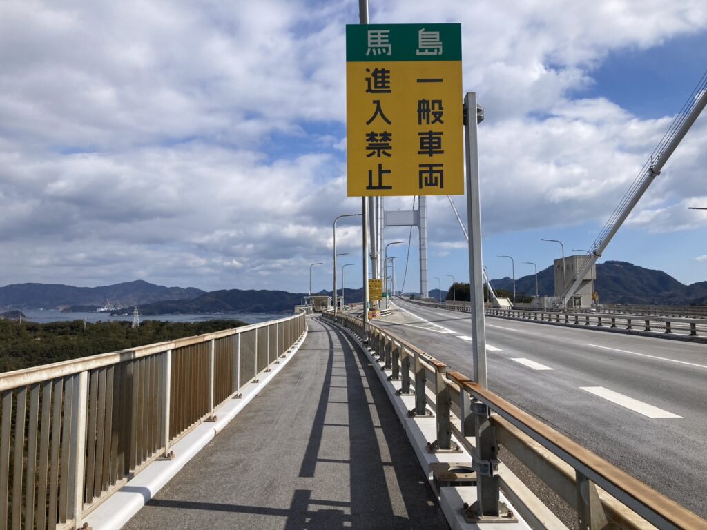 しばらく進むと来島海峡大橋入口の看板があり、案内に沿って歩行者道方向に進みます。通行料は大島までバイクが200円、自転車と歩行者は無料です。ちなみに車だと高速代が900円かかります。橋につながる接続道路を上って行くと、カメラを構える多くの人がいます。何をしているのかを訪ねると、すぐ下の造船所で船の浸水式をやっているとのこと。めずらしい光景に出会いました。接続道路をさらに上って、車が走る高速道路まで来ると、ここからが来島海峡大橋になります。来島海峡大橋は、来島海峡第一大橋、来島海峡第二大橋、来島海峡第三大橋の3つの橋の総称で、全長は4105 mであります。まずは橋長1570mの栗島海峡第三大橋を渡ります。お天気も良く、風も吹いていないので快適に走れます。途中、自転車の人に会いますが、走っている人には会いません。来島海峡第三大橋を渡り終える手前で「馬島・一般車両進入禁止」という看板がありました。しばらく進むと歩道から下っていく入口があって、ここから橋の真下にある小さな島「馬島」に行けるようです。