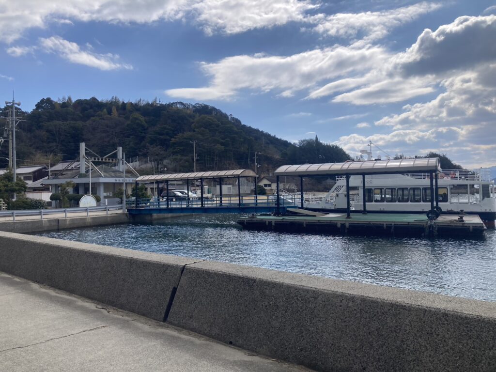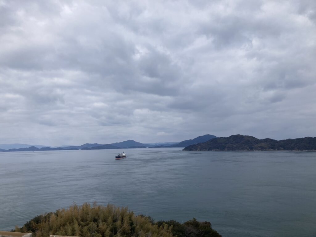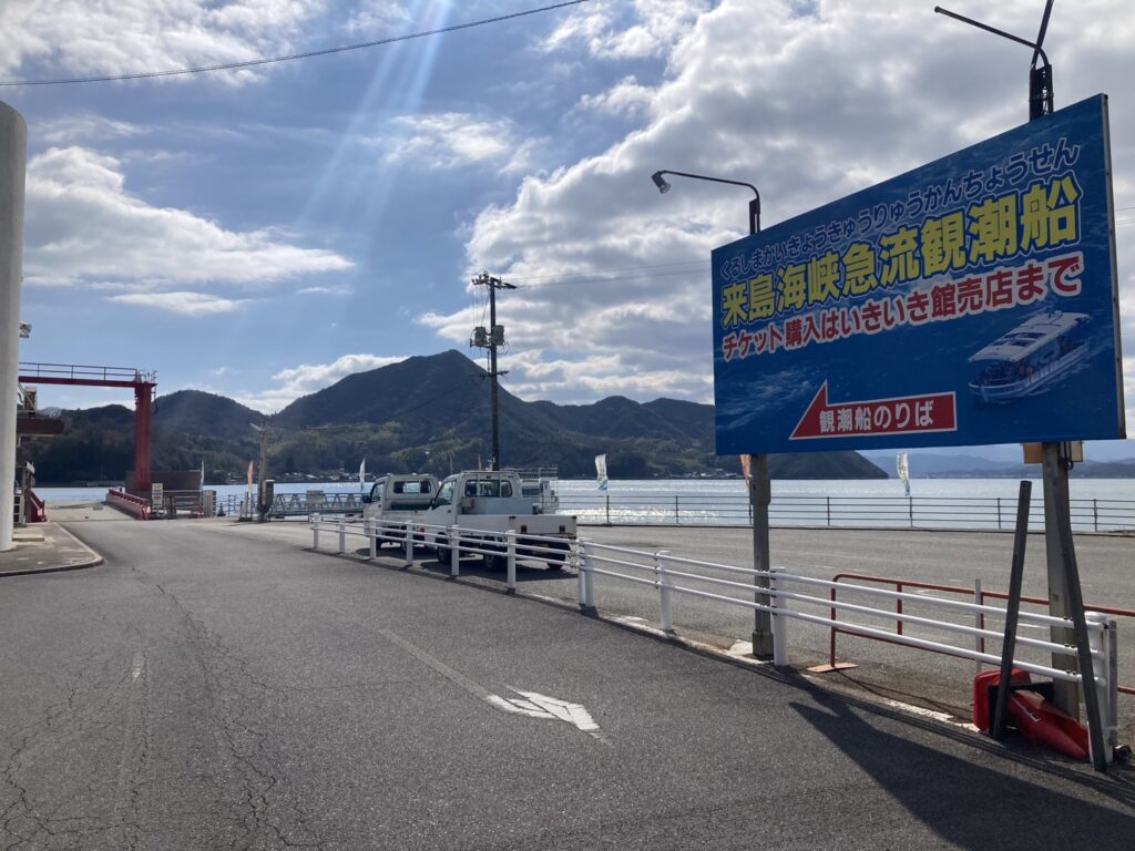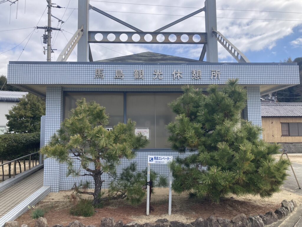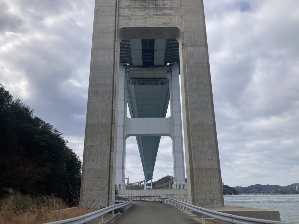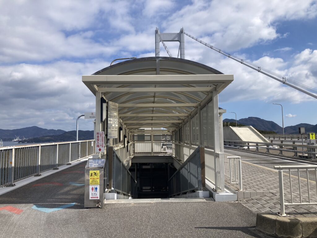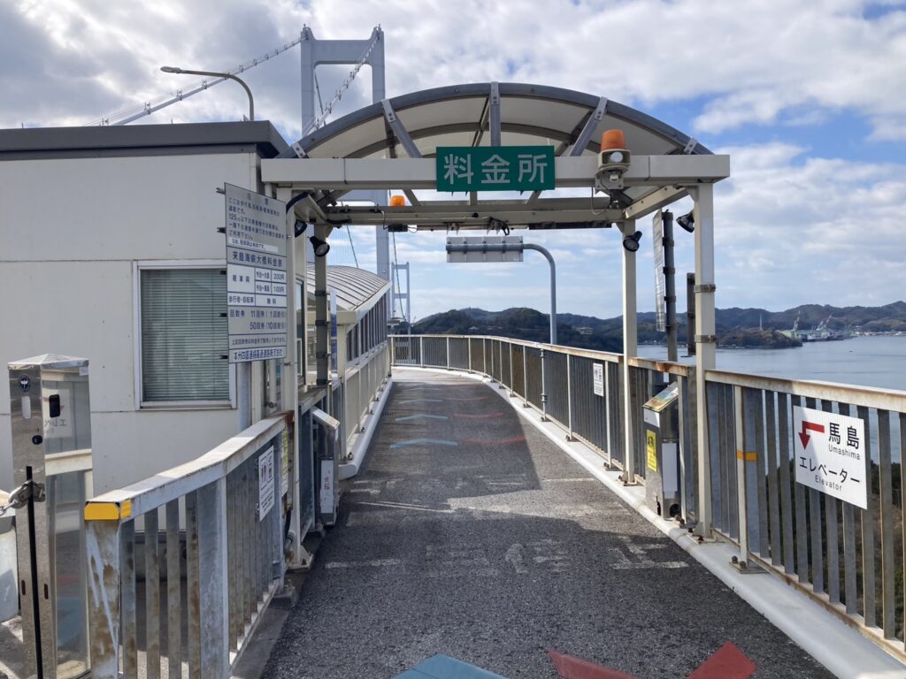せっかくなので入口を下って行って、馬島に立ち寄りしました。入口を奥に進むとエレベーターがあって、1階まで降りて馬島に上陸。人も住んでいて、堤防では釣りをしている人がいます。遊覧船乗り場には、馬島観光休憩所があります。来島海峡第三大橋が上を通っているので、真下からの橋が見れます。島をぐるりと周って、エレベーターで来島海峡大橋に戻ります。