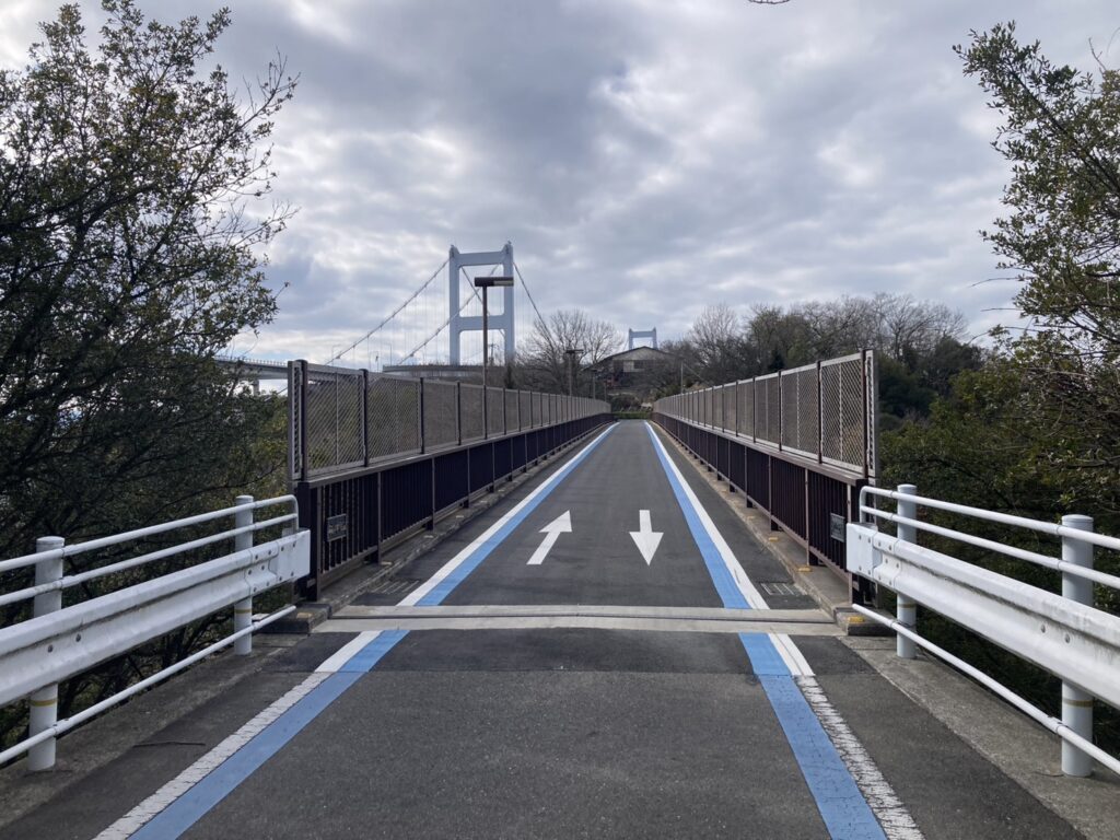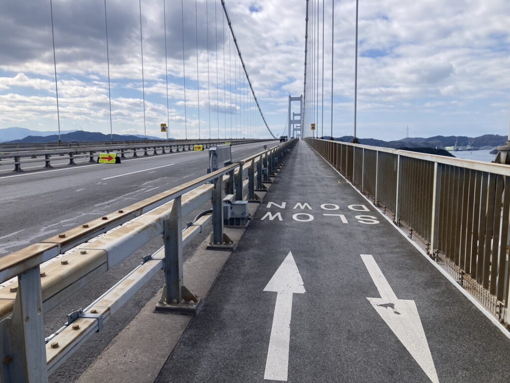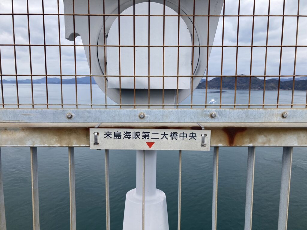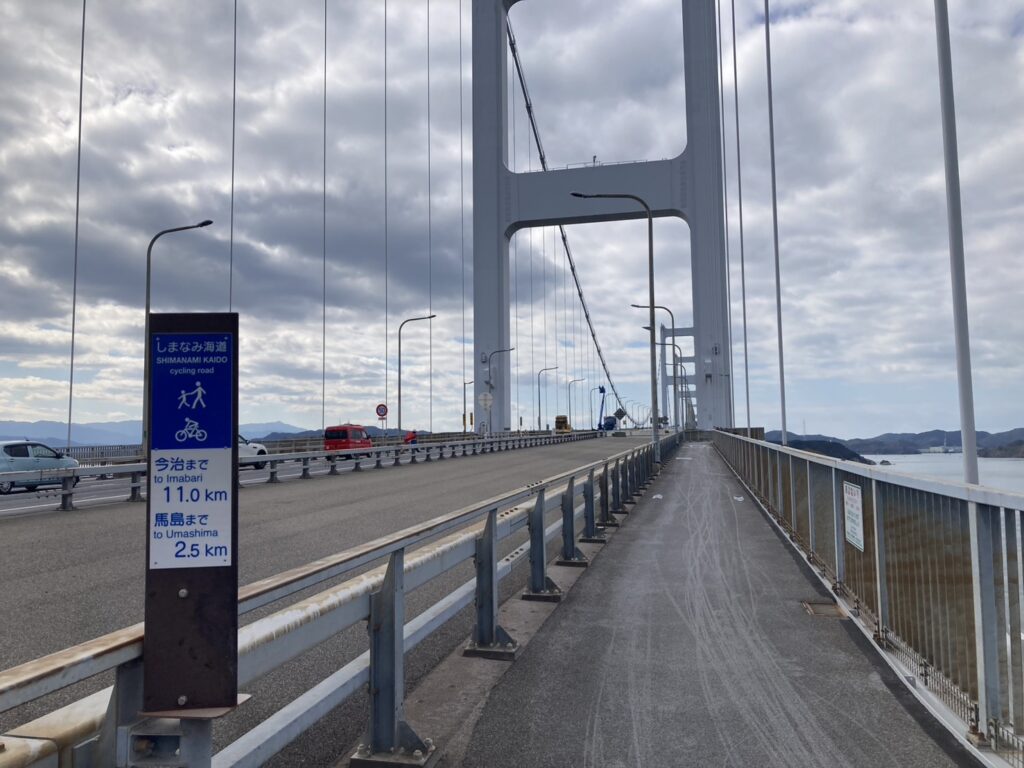 橋に戻って、ここからは橋長1515mの来島海峡第二大橋になります。橋の途中には何か所か休憩スペースがあって、ベンチがあって休憩ができます。しばらく走って、そのまま橋長960mの来島海峡第一大橋になります。この辺まで来ると大島がだいぶ近くに見えます。来島海峡第一大橋を渡り終えて、接続道路を下って行って、大島に上陸しました。